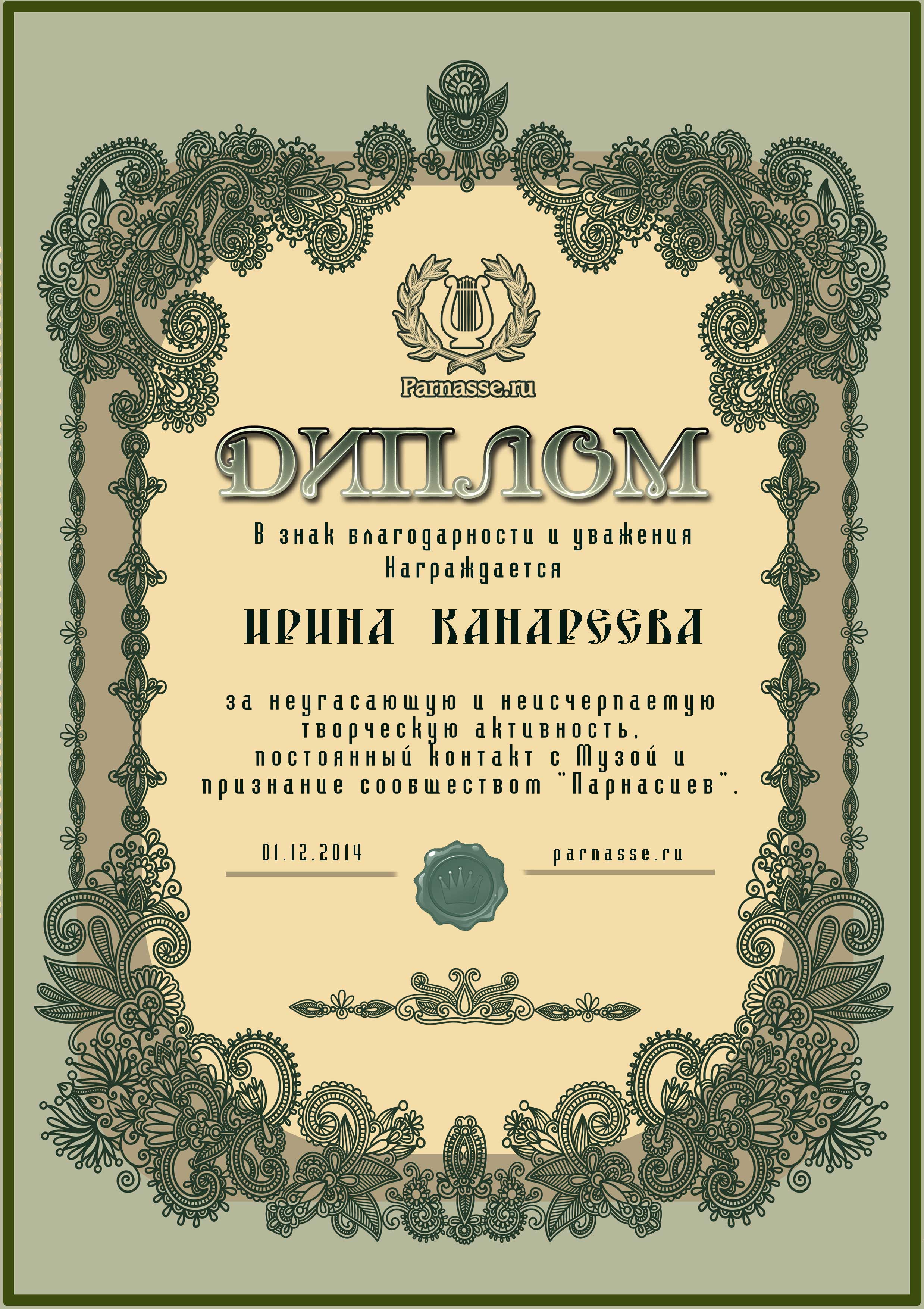 За неугасающую и неисчерпаемую творческую активность, постоянный контакт с Музой и признание сообществом "Парнасцев".От всей души желаем Вам, Ирина, здоровья, любви, успехов, благополучия, удачи и творческого вдохновения!