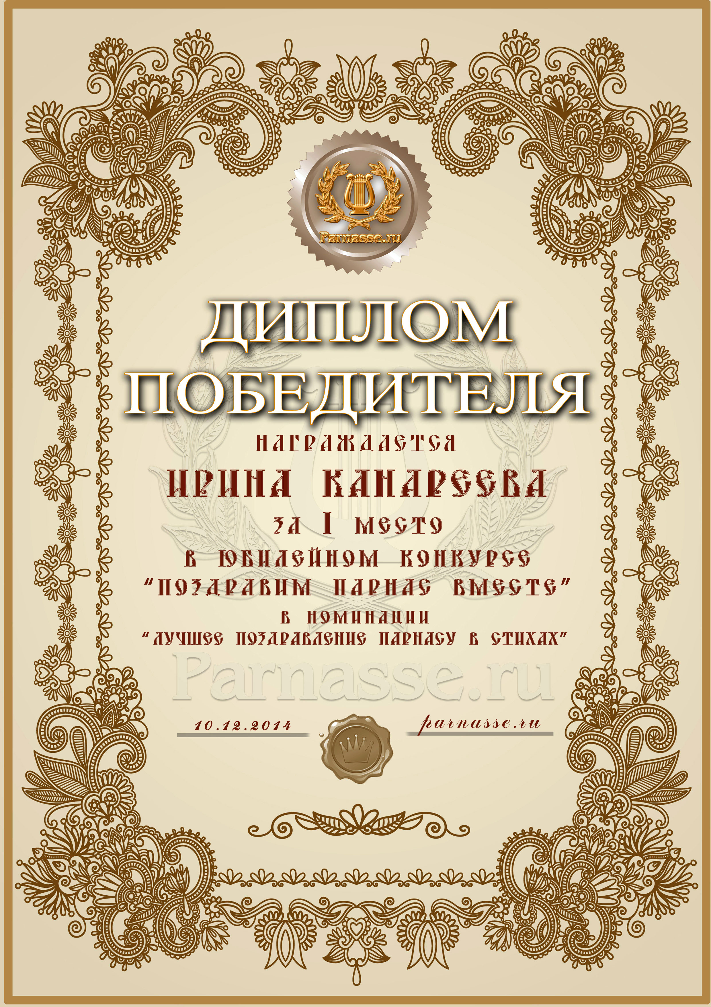 Первое место в праздничном конкурсе "ПОЗДРАВИМ ПАРНАС ВМЕСТЕ!", в номинации "Лучшее стихотворное поздравление Парнасу". Позвольте от всей души выразить Вам благодарность за прекрасные поэтические слова поддержки, самые тёплые пожелания нашему Парнасу и пожелать Вам новых побед на литературном поприще, успехов в жизни и всех Ваших начинаниях! Будьте счастливы, здоровы, пусть удача не покидает Вас ни на минуту и от всей души СПАСИБО! Оставайтесь с нами и мы будем вновь и вновь встречать Дни рождения "Парнаса" в одной дружной, душевной компании! Произведение "С Днём Рождения, Парнас! Поздравление-тост"