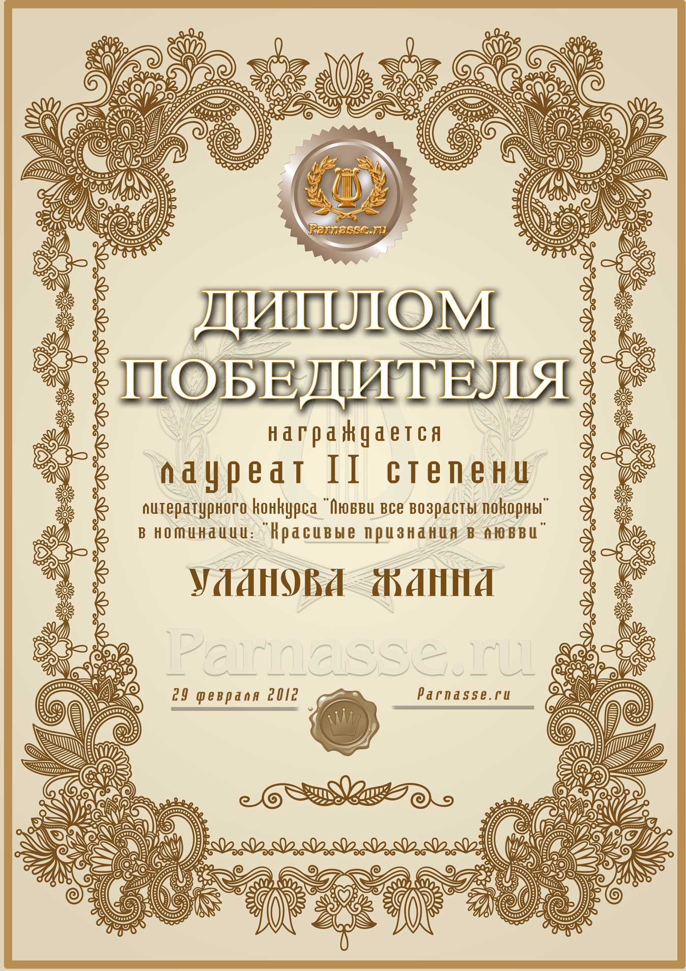 Диплом лауреата II степени сетевого лит. конкурса "Любви все возрасты покорны" в номинации "Красивые признания в любви" (Общее голосование)