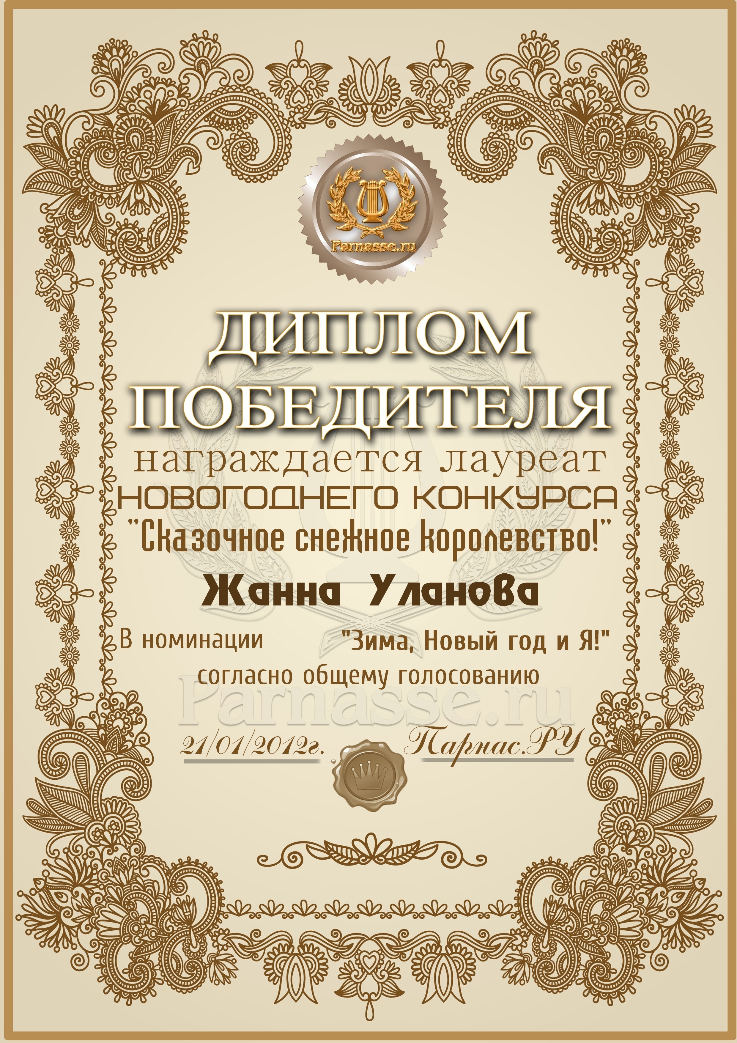 Лауреату новогоднего конкурса "Сказочное снежное королевство!" за первое место в номинации "Зима, Новый год и Я!" согласно общему голосованию.Произведение «Новогодняя ночь».