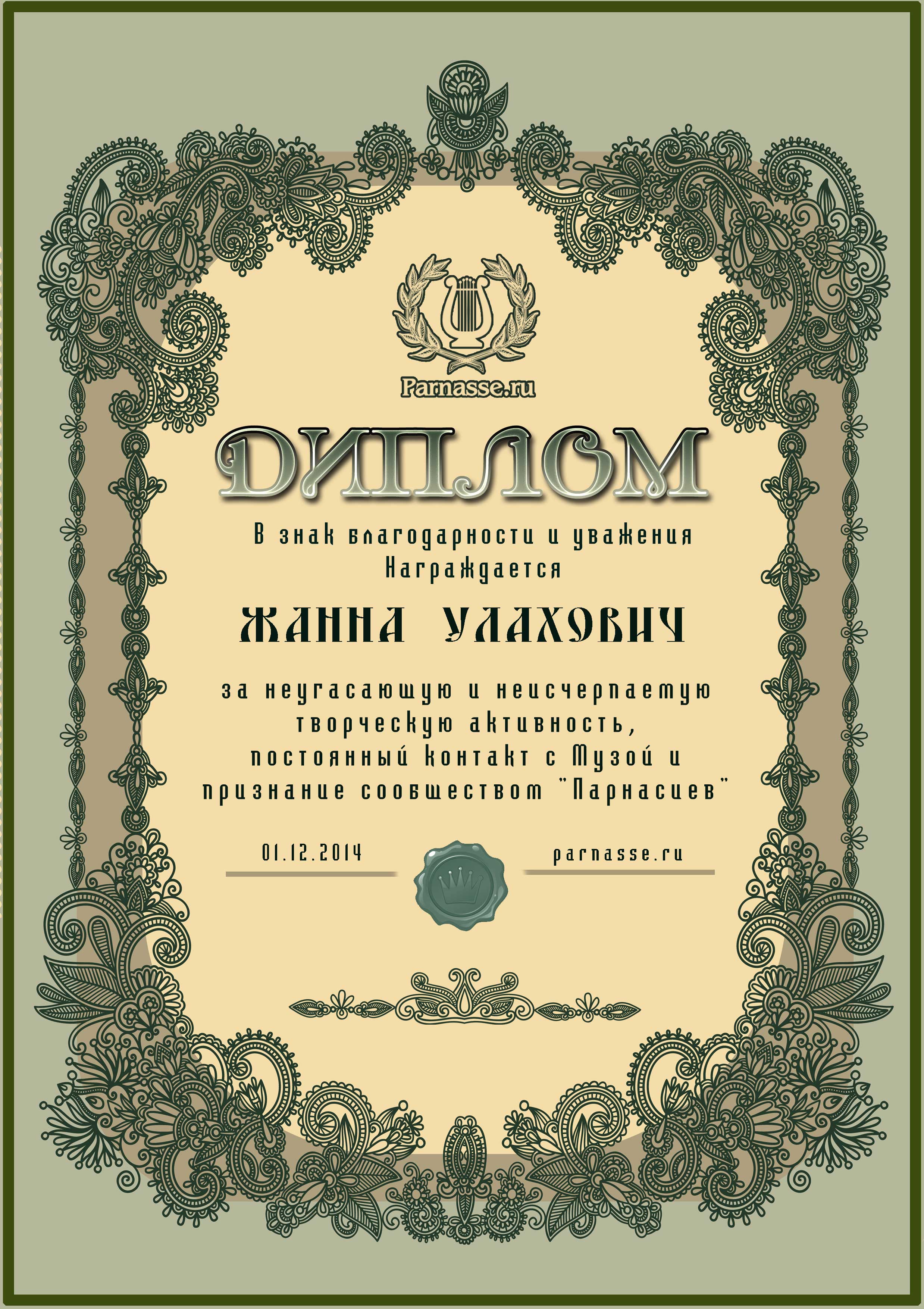 За неугасающую и неисчерпаемую творческую активность, постоянный контакт с Музой и признание сообществом "Парнасцев".От всей души желаем Вам, Жанна, здоровья, любви, успехов, благополучия, удачи и творческого вдохновения!