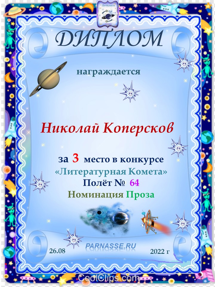 Поздравляю с занятым 3 местом в конкурсе "ЛитКомета-Полёт № 64" в Номинации Проза!