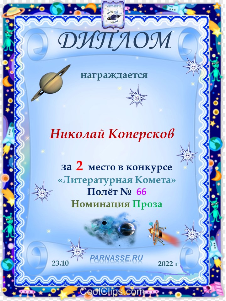 Поздравляю с занятым 2 местом в конкурсе "ЛитКомета-Полёт № 66" - Номинация Проза!
