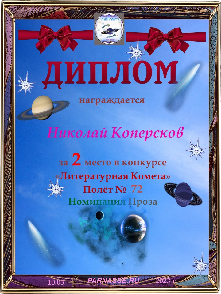 Поздравляю с занятым 2 местом в конкурсе "ЛитКомета-Полёт № 72" - Номинация Проза!