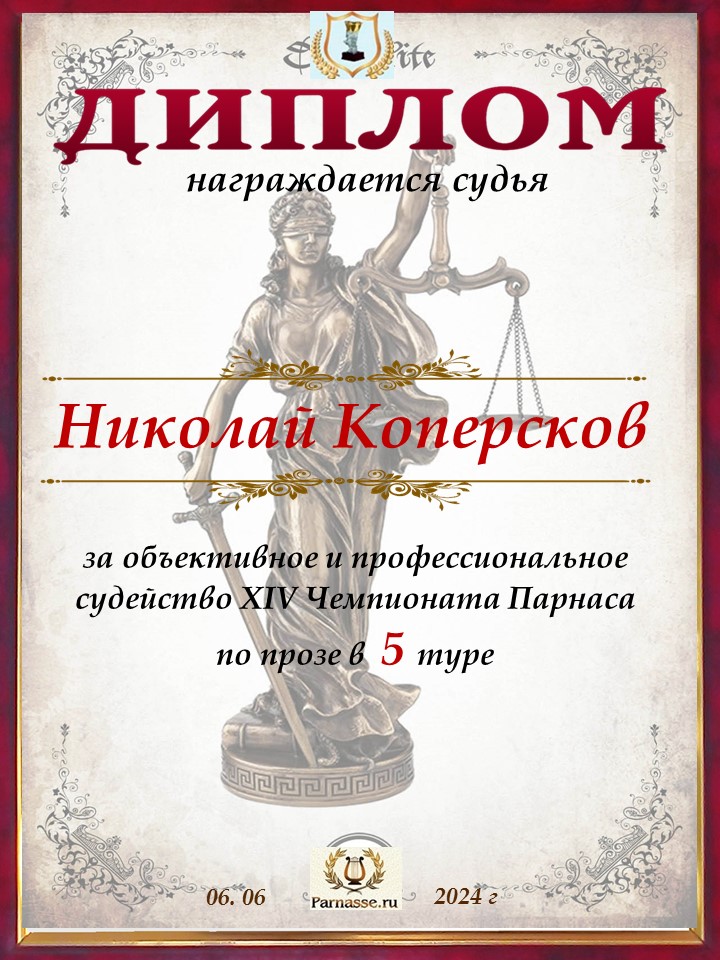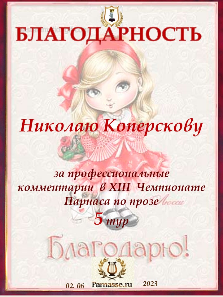 Спасибо за объективное и профессиональное судейство в 5 туре XIV Чемпионате Парнаса по прозе!