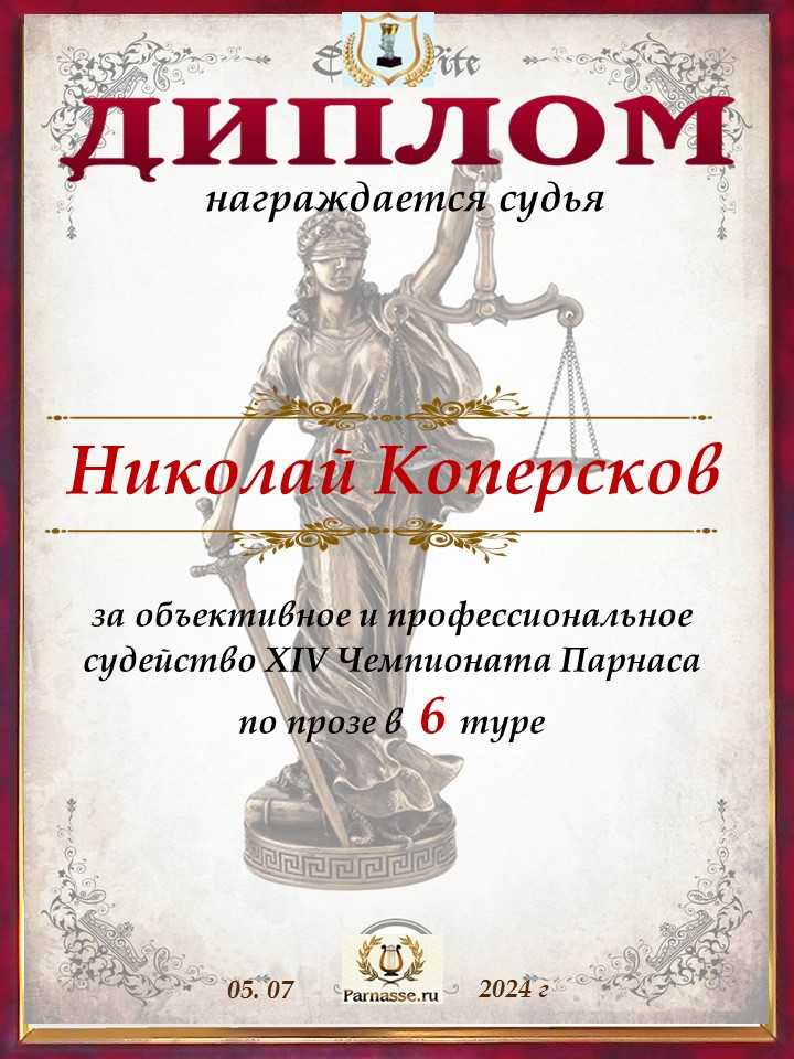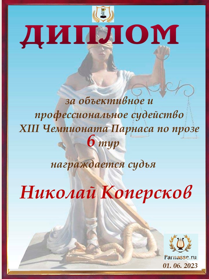 Спасибо за объективное и профессиональное судейство в 6 туре XIII Чемпионате Парнаса по прозе!