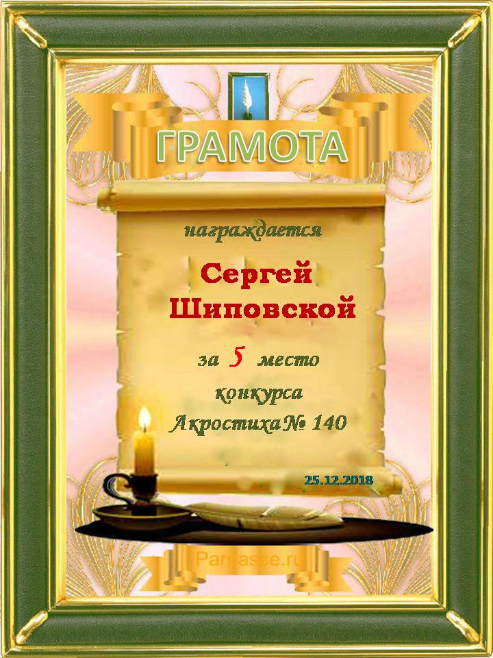Грамота за 5 место в 140 конкурсе АКРОСТИХА (Альтернатива)! ПОЗДРАВЛЯЮ!