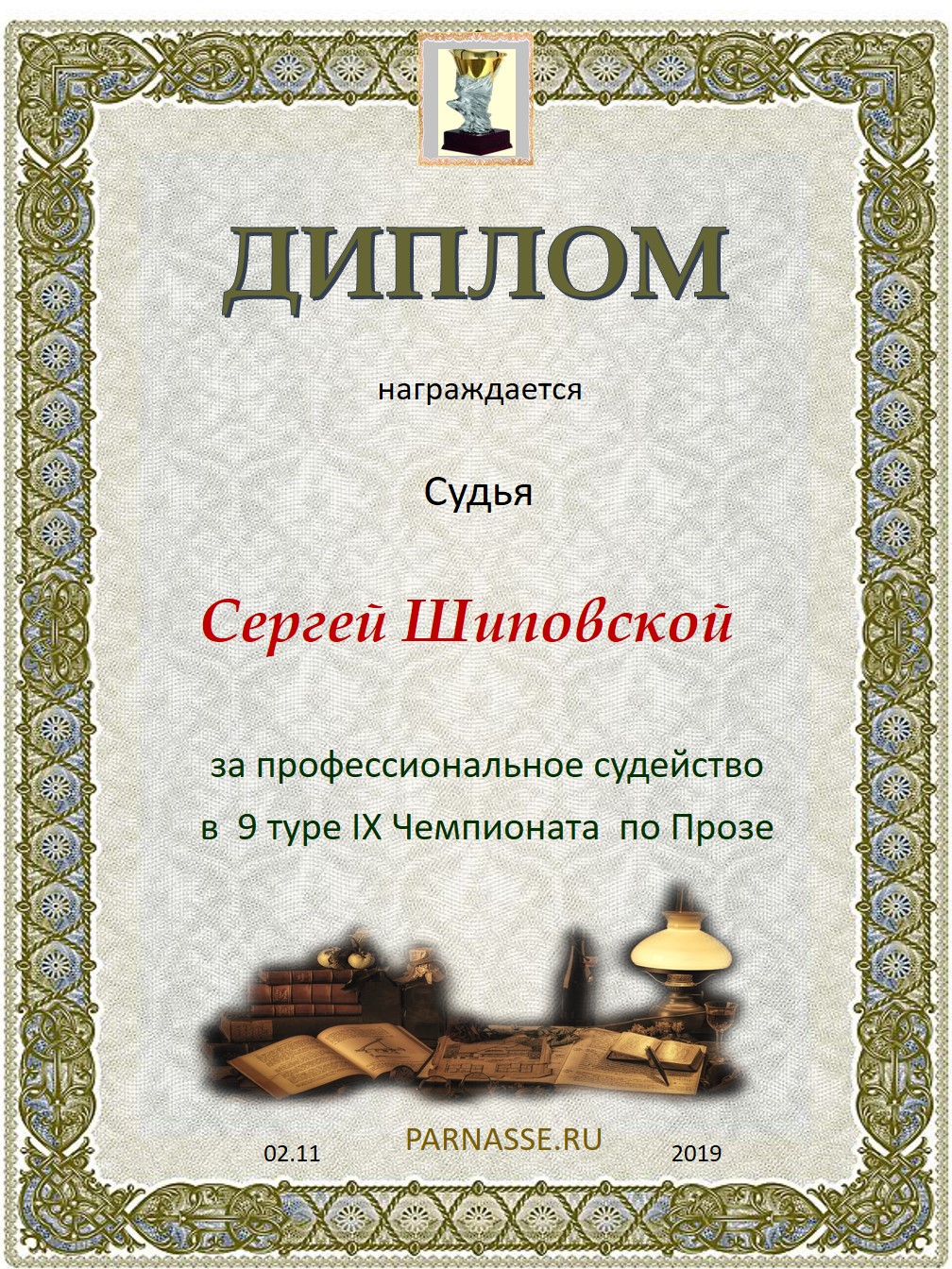 Вручается за профессиональное и объективное судейство в 9 туре XIII Чемпионата Парнаса по прозе