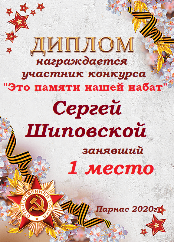 Первое место по решению Администрации и Главного судьи конкурса "Навечно в памяти"