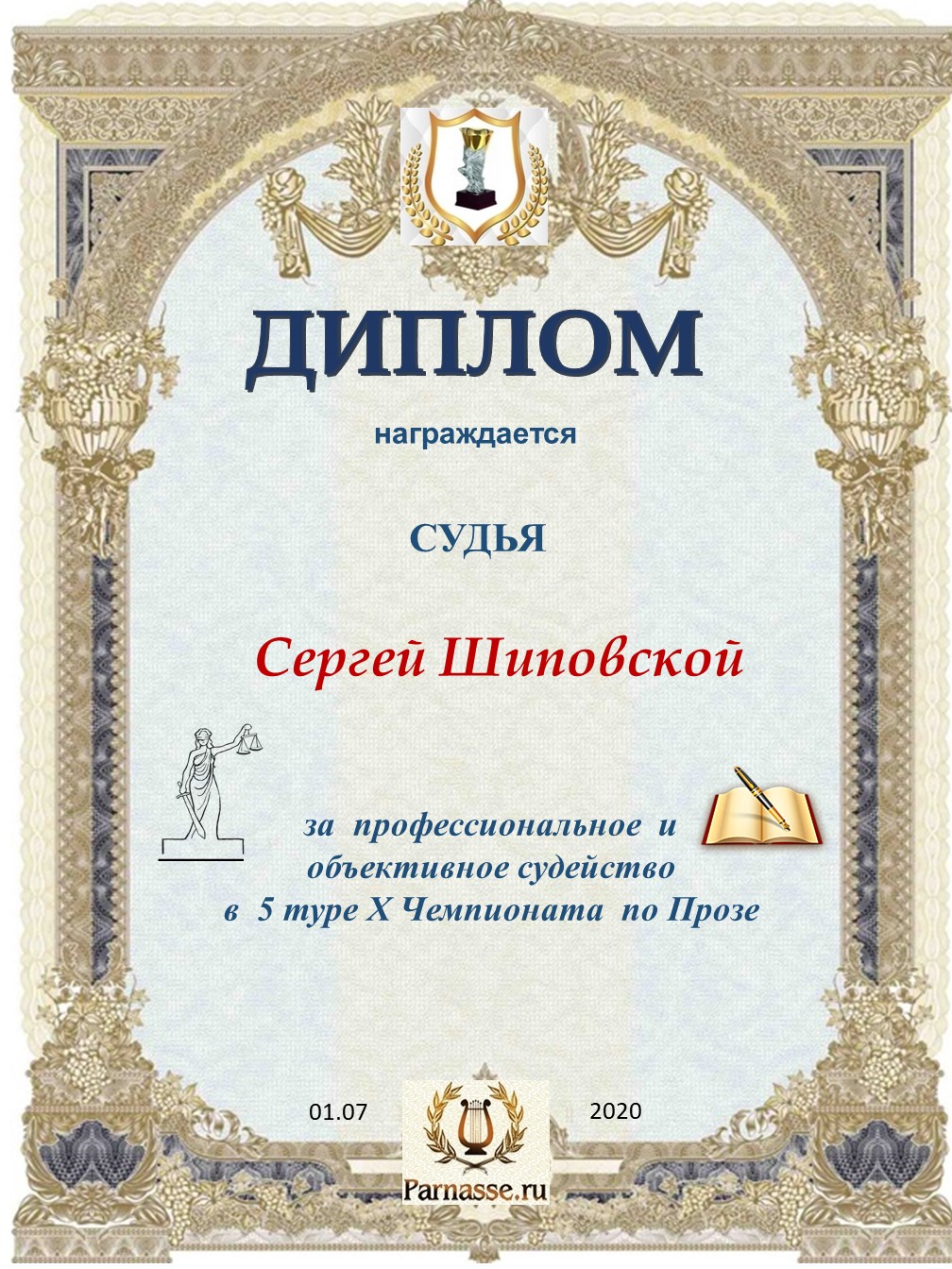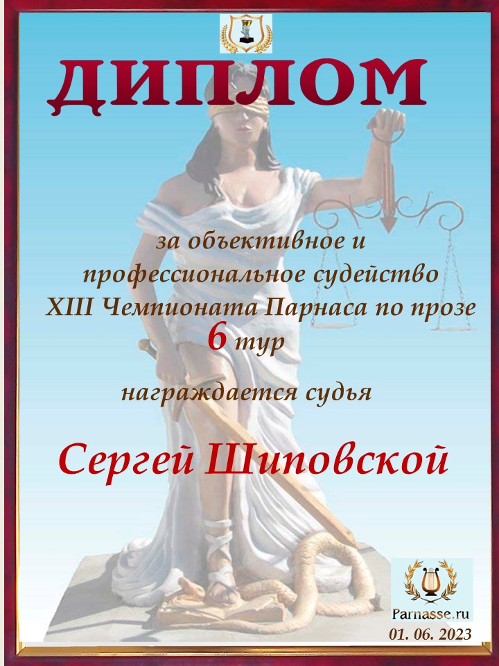 Вручается за профессиональное и объективное судейство в 6 туре XIII Чемпионата Парнаса по прозе