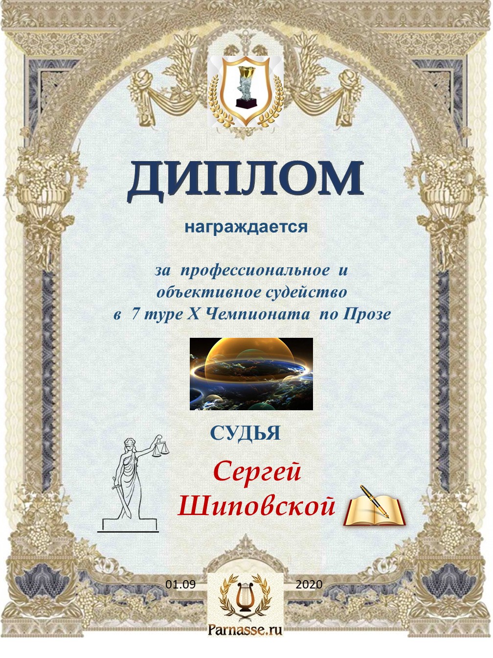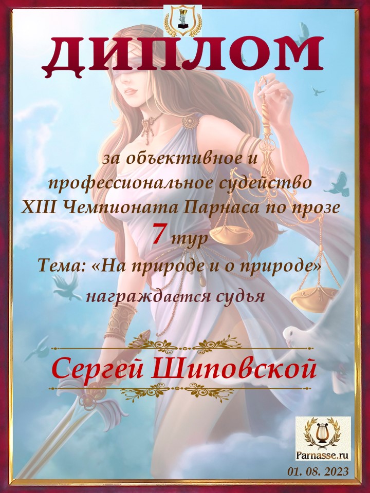 Вручается за профессиональное и объективное судейство в 7 туре XIII Чемпионата Парнаса по прозе