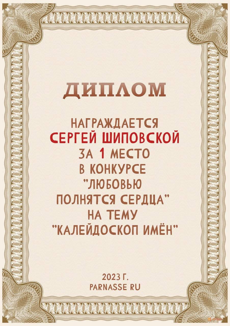 1 место в конкурсе"Любовью полнятся сердца" на тему " Калейдоскоп имён" .Поздравляем!