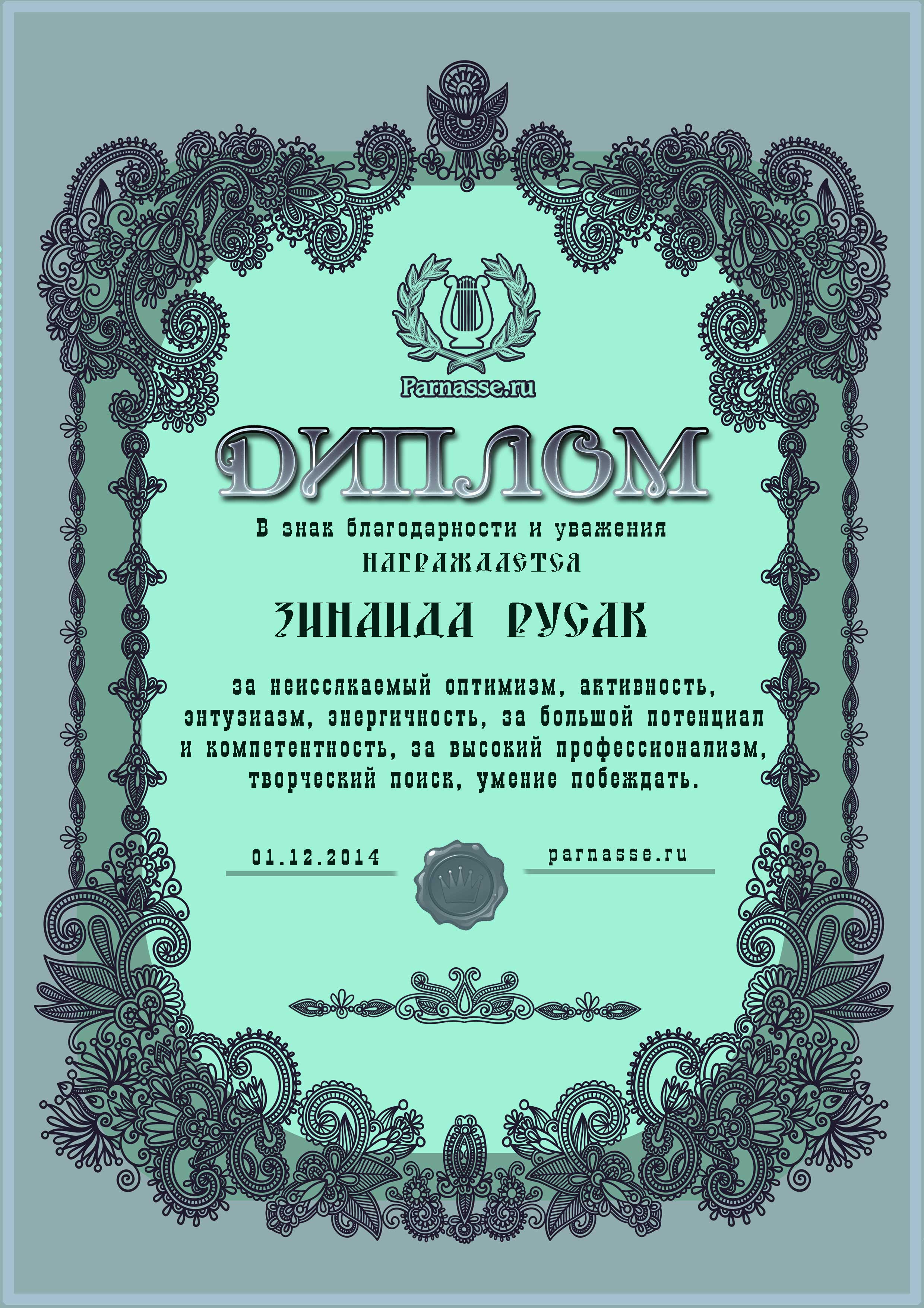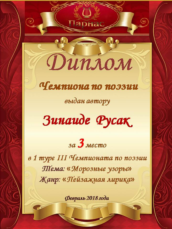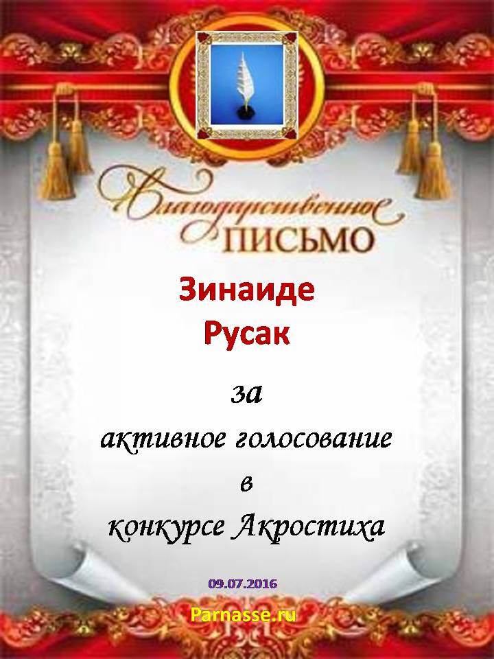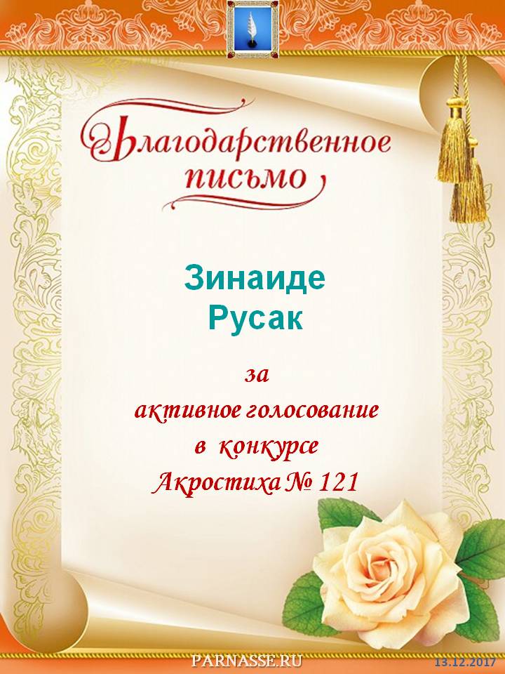 За неугасающую и неисчерпаемую творческую активность, постоянный контакт с Музой и признание сообществом "Парнасцев".От всей души желаем Вам, Зинаида, здоровья, любви, успехов, благополучия, удачи и творческого вдохновения!