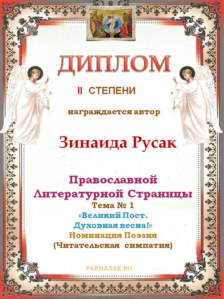 За 4-е место на Православной Литературной Странице, Тема № 1 "Великий Пост. Духовная весна!" Номинация Поэзия. Читательская симпатия.