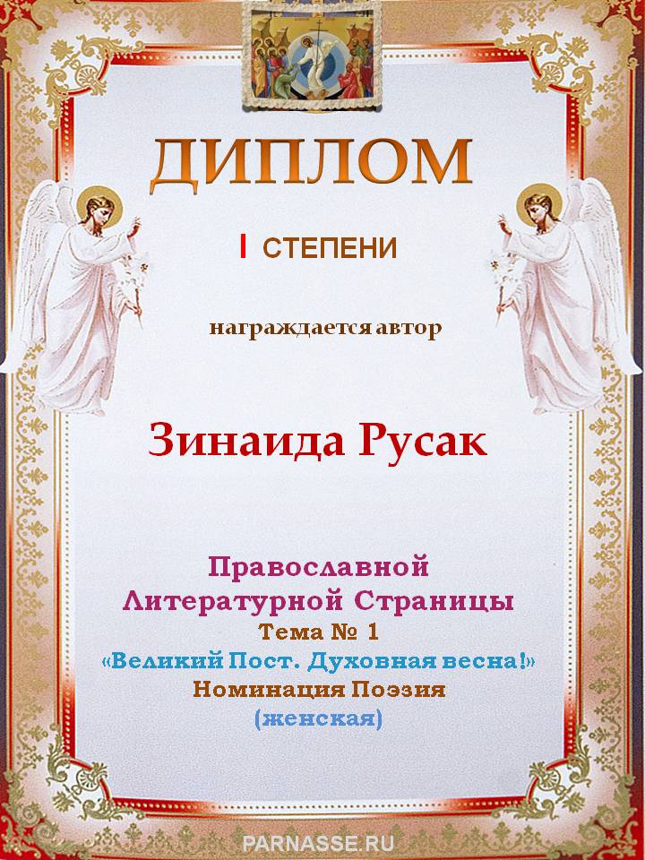За прекрасную победу на Православной Литературной Странице, Тема № 1 "Великий Пост. Духовная весна!"Номинация Поэзия.