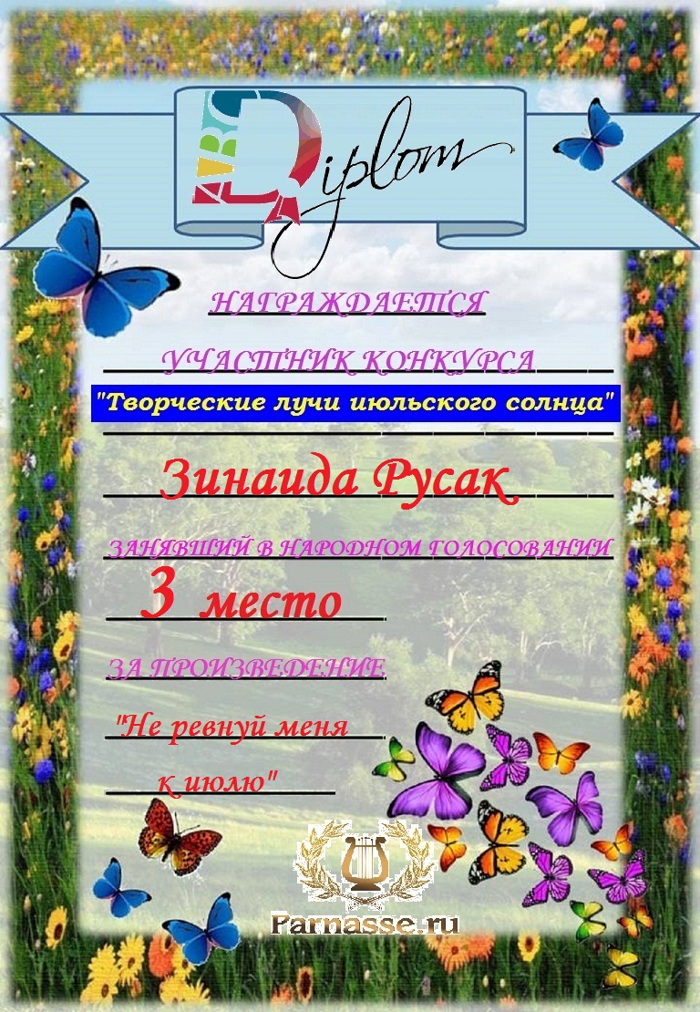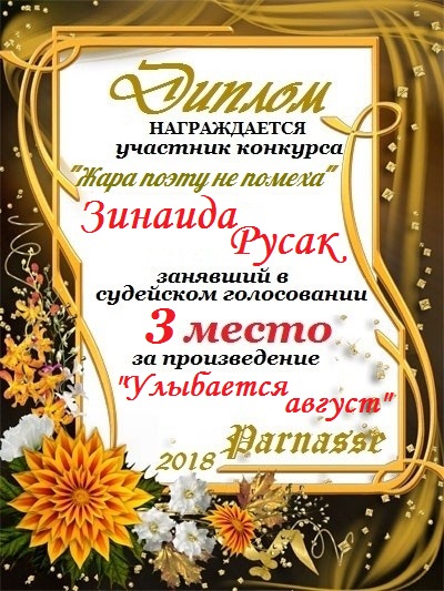 ТРЕТЬЕ МЕСТО в судейском голосовании конкурса "Жара поэту не помеха". Поздравляем, Зинаида!