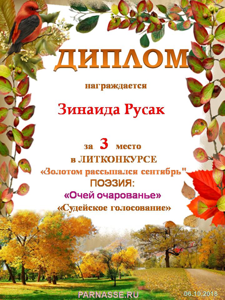 Третье место в конкурсе "Золотом рассыпался сентябрь", в поэтической номинации "Очей очарование", народное голосование. Поздравляем с победой