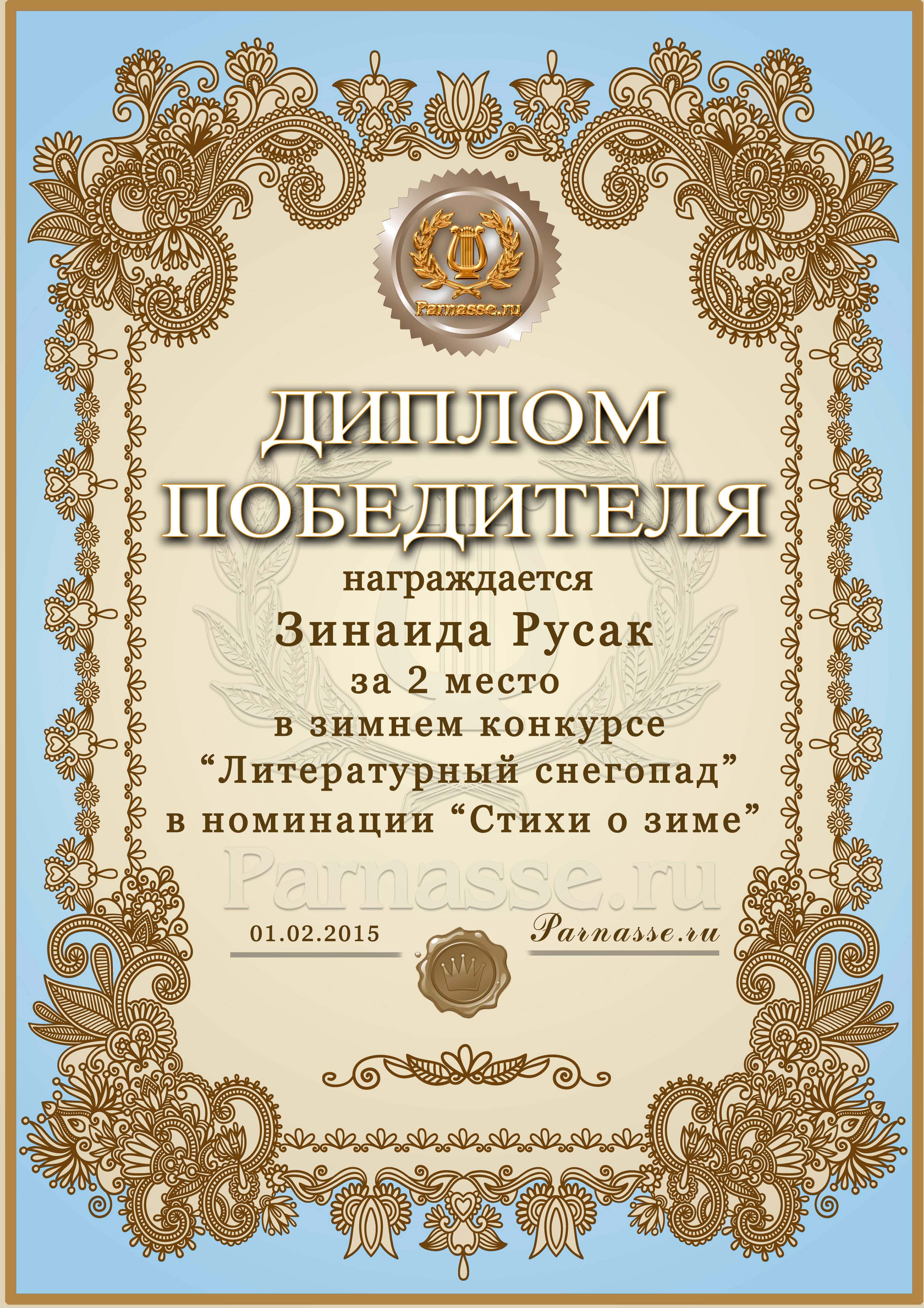 Диплом за 2 место в конкурсе "Литературный снегопад".