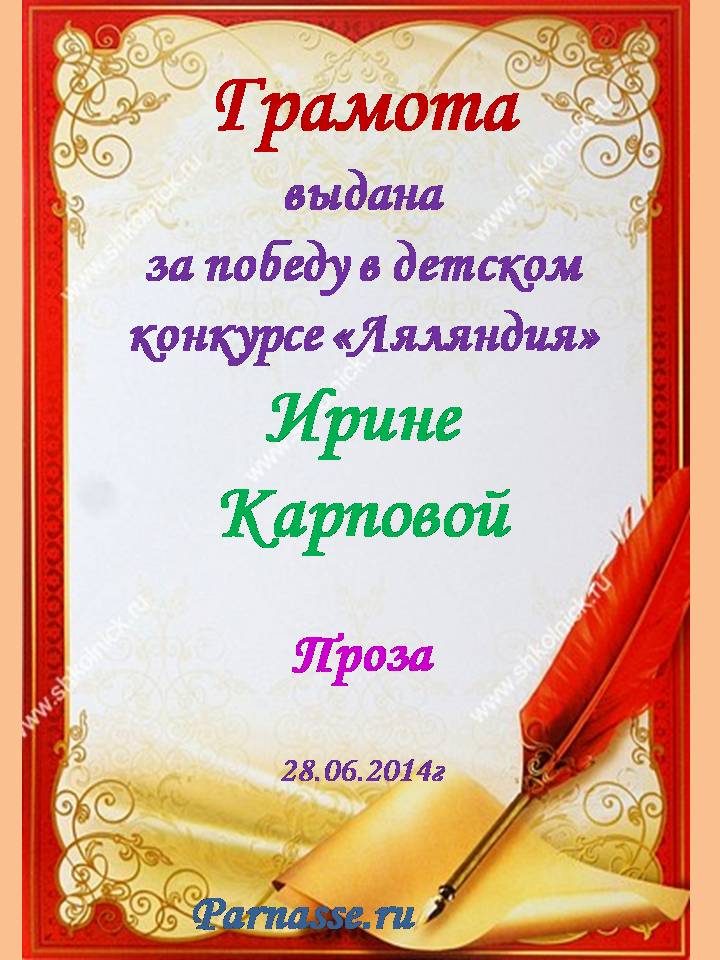 Победителю музыкально-литературного конкурса "Ах, Мама, Мамочка, родная!" Номинация "Рассказы-сказки о Мамочке". Поздравляем! Счастья Вам и всего замечательного. Желаем хорошего настроения, вдохновения и удачи во всем. Спасибо за участие в конкурсе. С Уважением, Администрация.