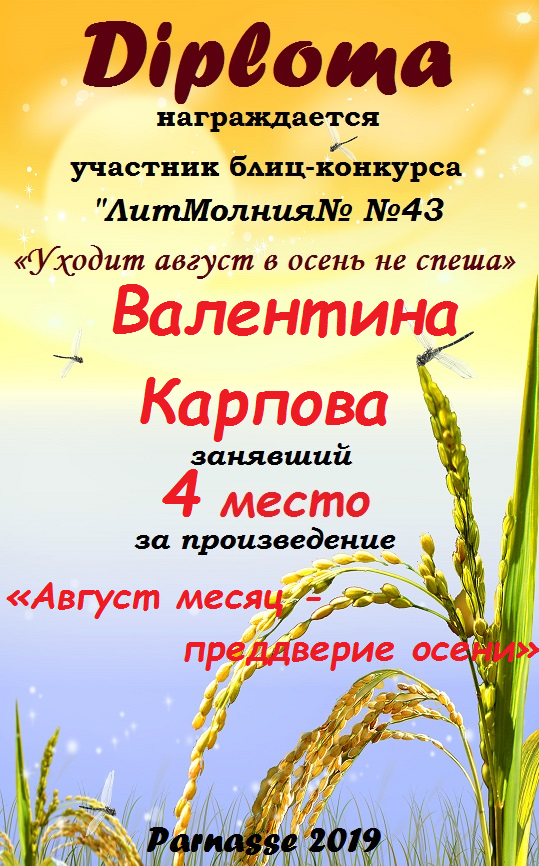 Поздравляем с занятым 3 местом в ЛИТКОНКУРСе «Золотом рассыпался сентябрь.,,», номинация – Проза (судейское голосование)!