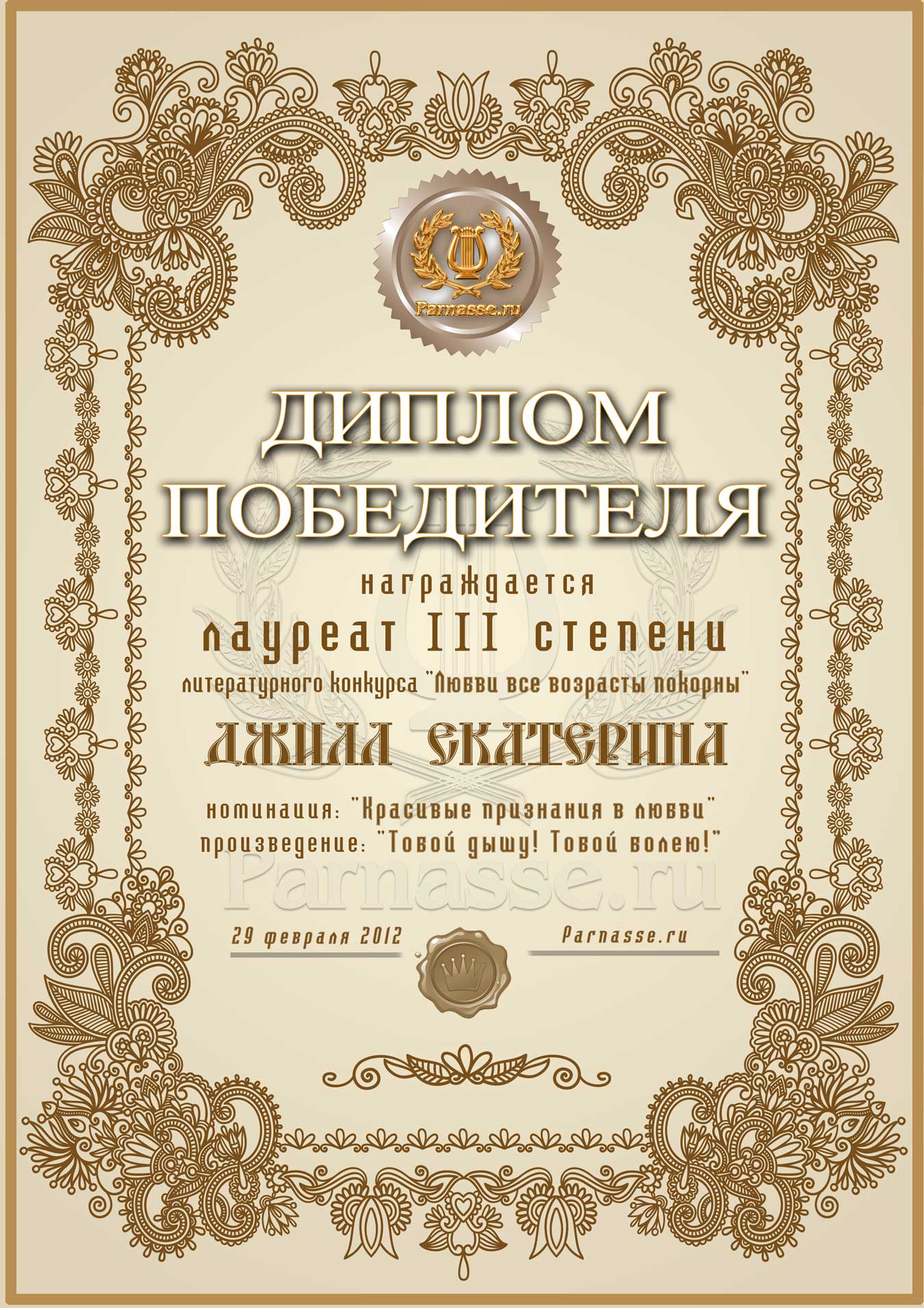 Диплом лауреата III степени лит.конкурса "Любви все возрасты покорны"