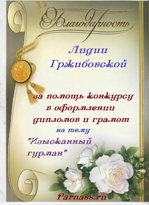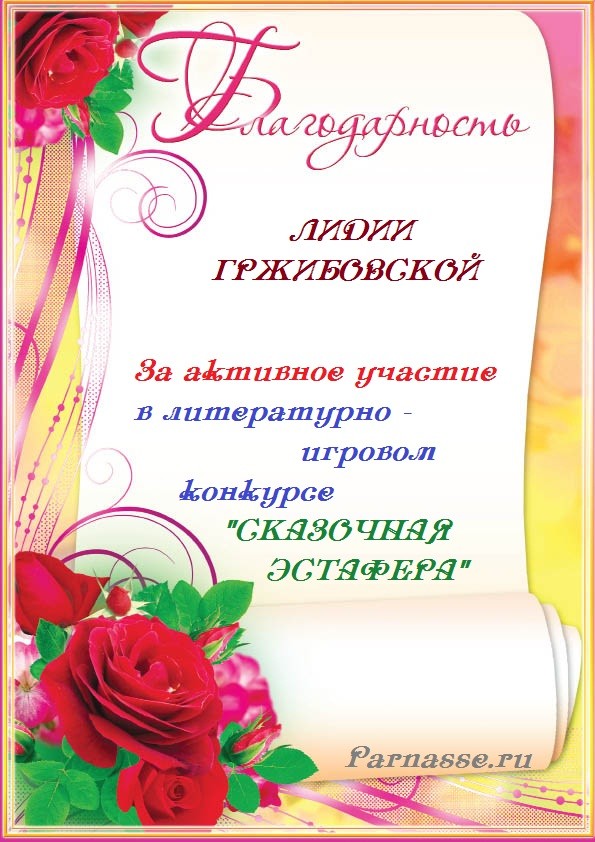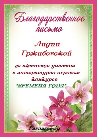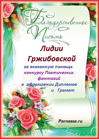 Уважаемая Лидия!Спасибо Вам большое за высокопрофессиональное, объективное судейство конкурсов на Парнасе!
