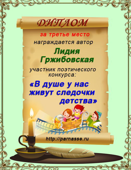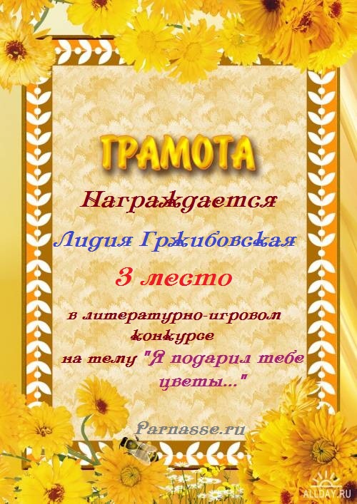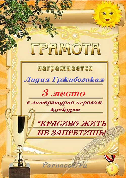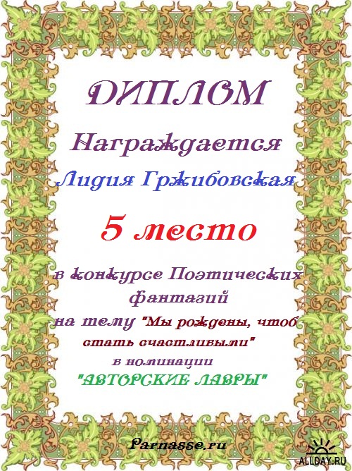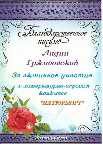 За неугасающую и неисчерпаемую творческую активность, постоянный контакт с Музой и признание сообществом "Парнасцев".От всей души желаем Вам, Лидия, здоровья, любви, успехов, благополучия, удачи и творческого вдохновения!