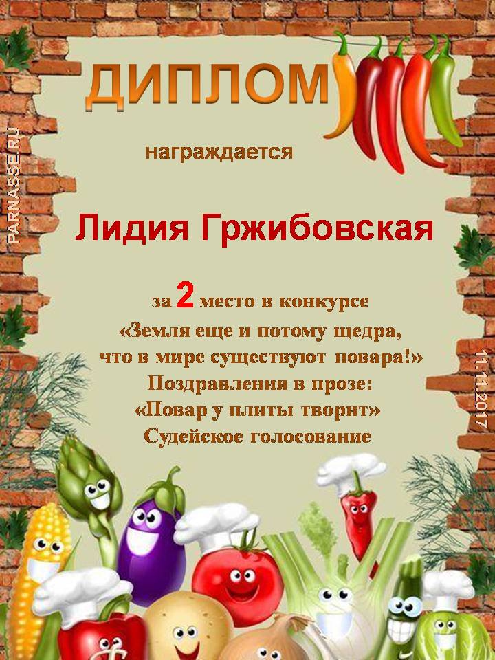 Второе место в конкурсе "Земля еще и потому щедра, что в мире существуют повара!" в номинации "Поздравления в прозе: Повар у плиты творит" - произведение "Тост: В мире много поваров", судейское голосование. Поздравляем с красивой победой!