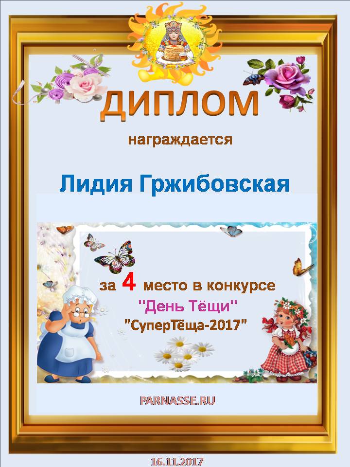 За участие в поэтическом конкурсе "СуперТёща-2017". Желаем вдохновения, счастья, семейного тепла и благополучия, любви близких людей.