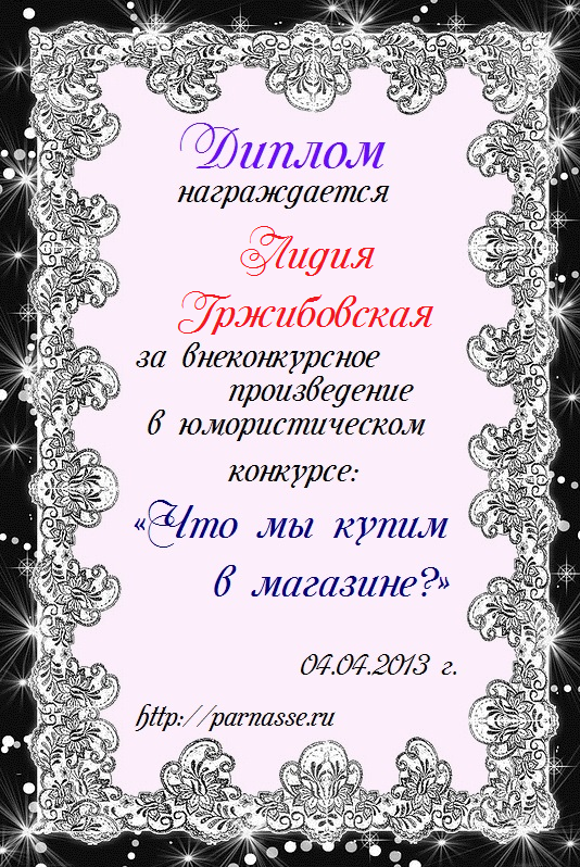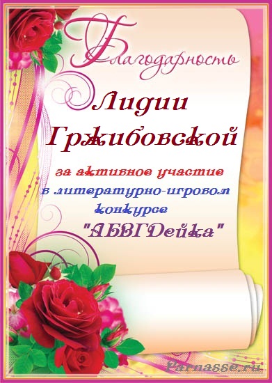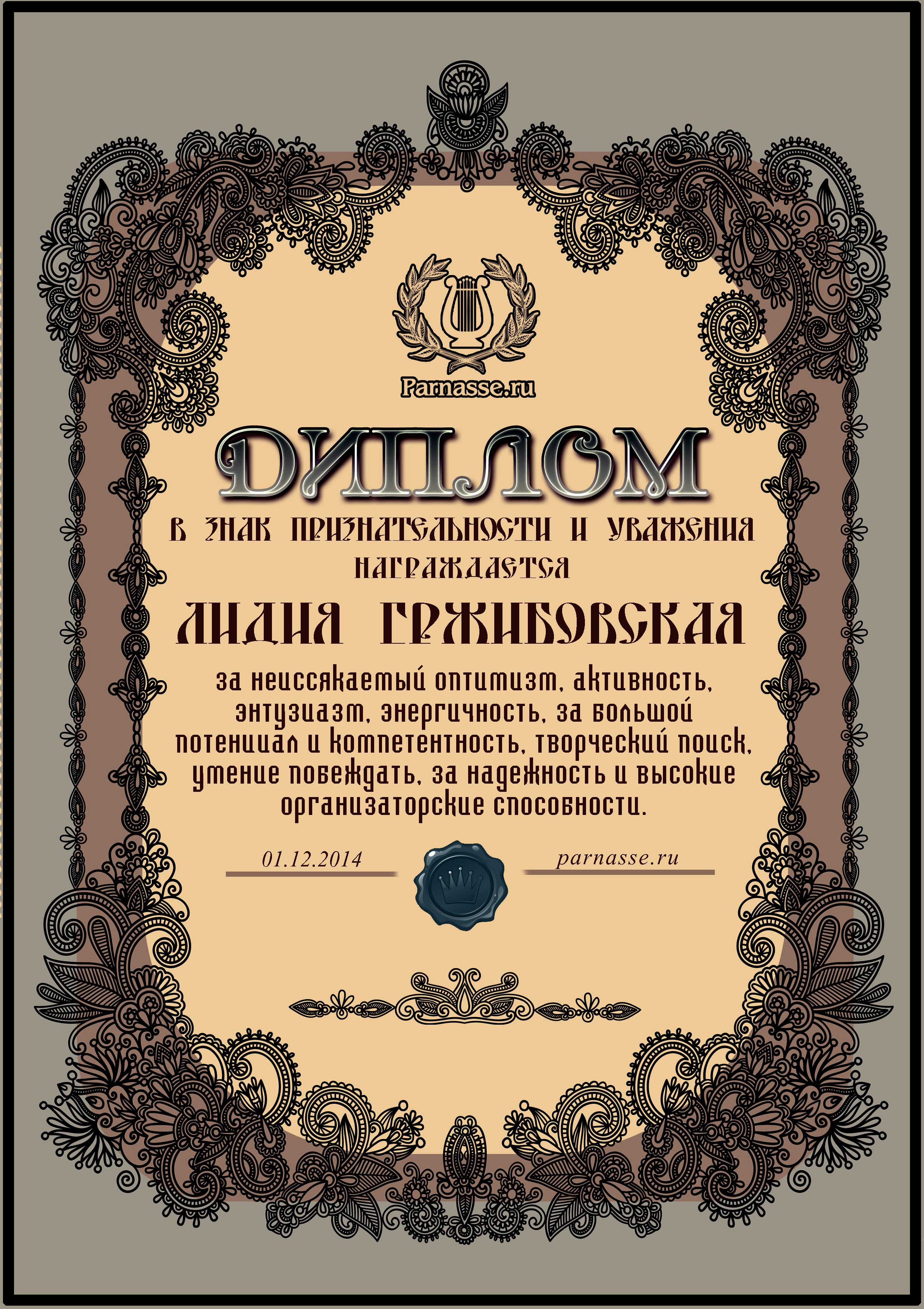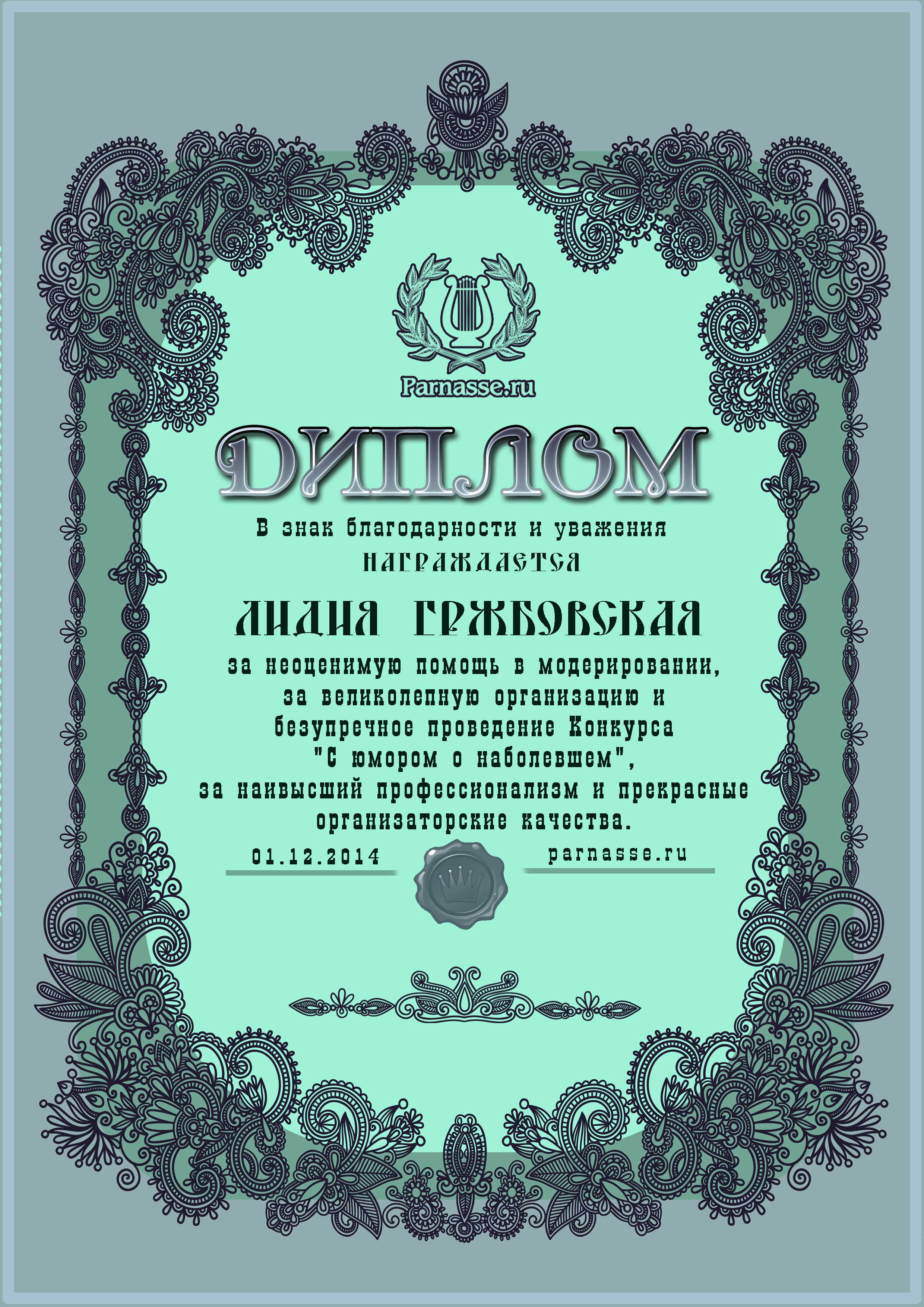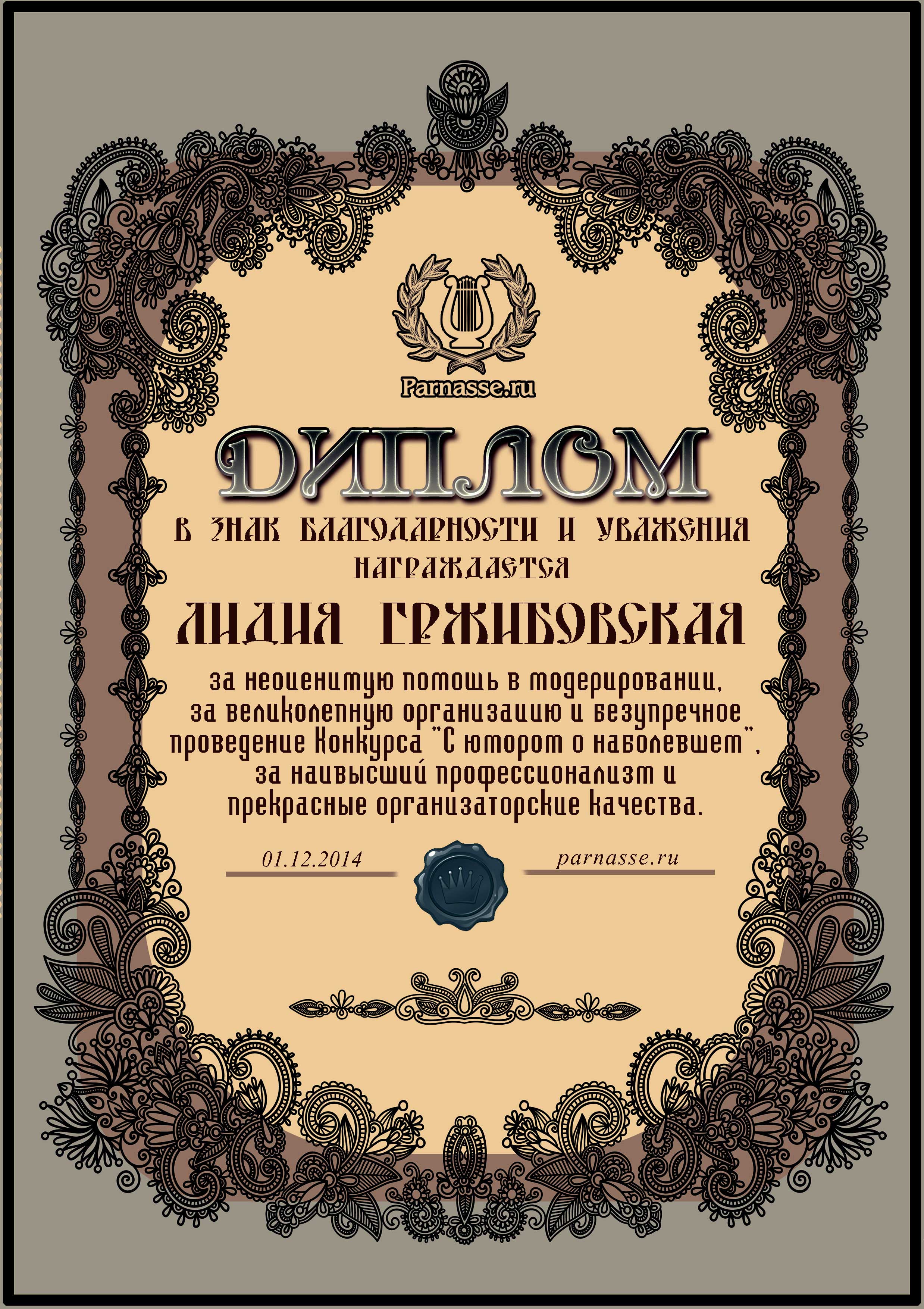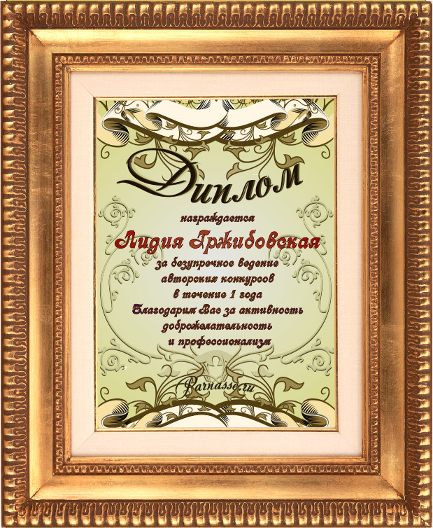 Диплом вручается от лица всех администраторов сайта, всех модераторов и всех ведущих конкурсов в знак благодарности и за помощь по всем вопросам! За огромный вклад в развитие Парнаса! За безупречное ведение конкурсов! Огромное спасибо добрейшему человеку на Парнасе!Спасибо, Лидия!