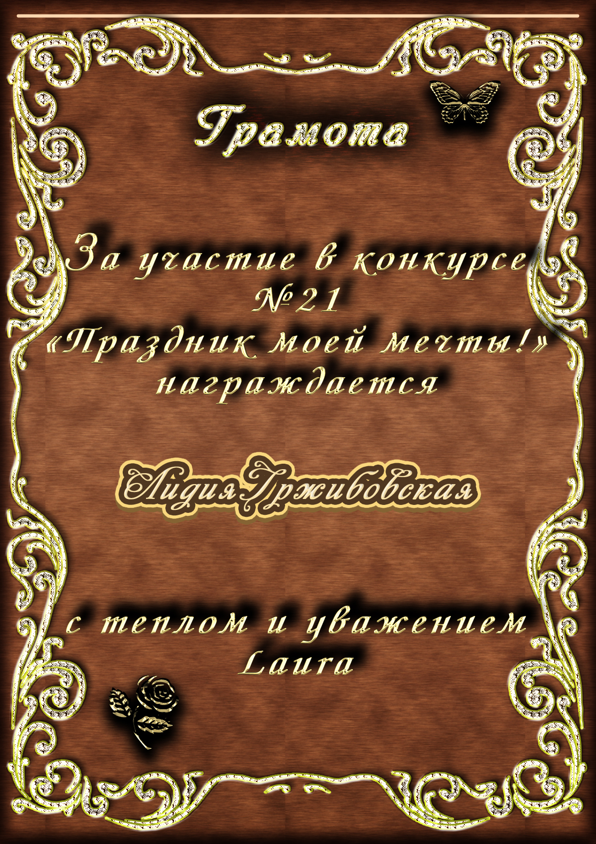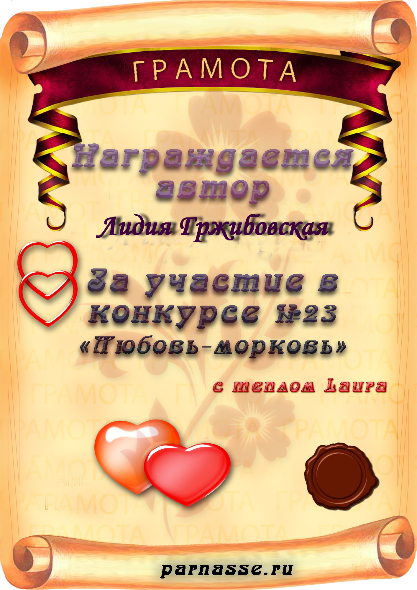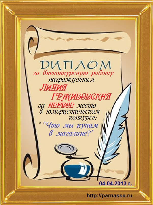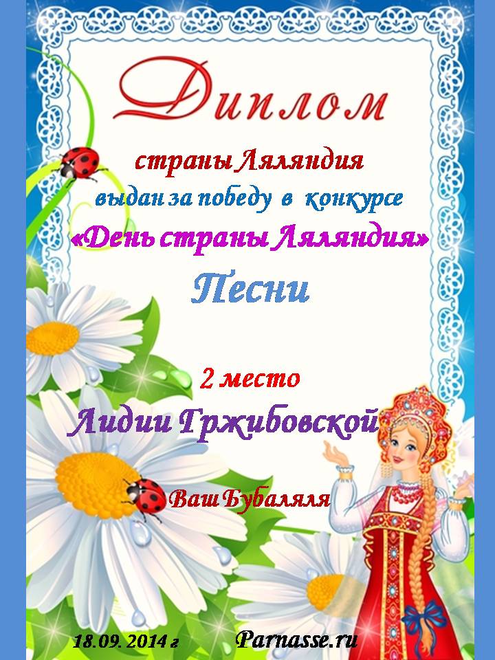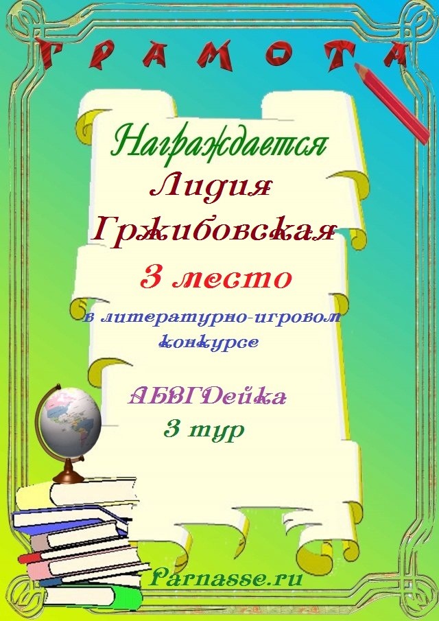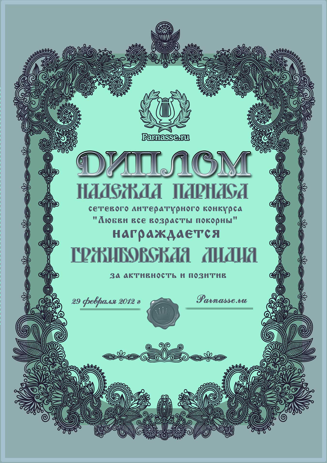 Диплом вручается от лица всех администраторов сайта, всех модераторов и всех ведущих конкурсов в знак благодарности и за помощь по всем вопросам! За огромный вклад в развитие Парнаса! За безупречное ведение конкурсов! Огромное спасибо добрейшему человеку на Парнасе!Спасибо, Лидия!