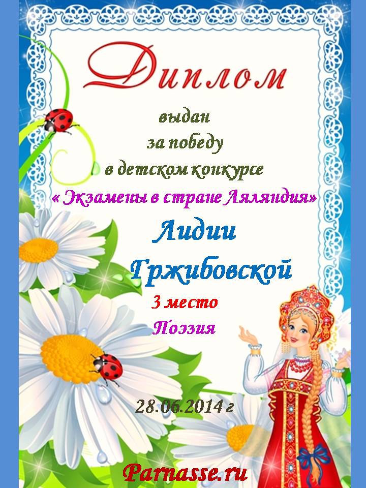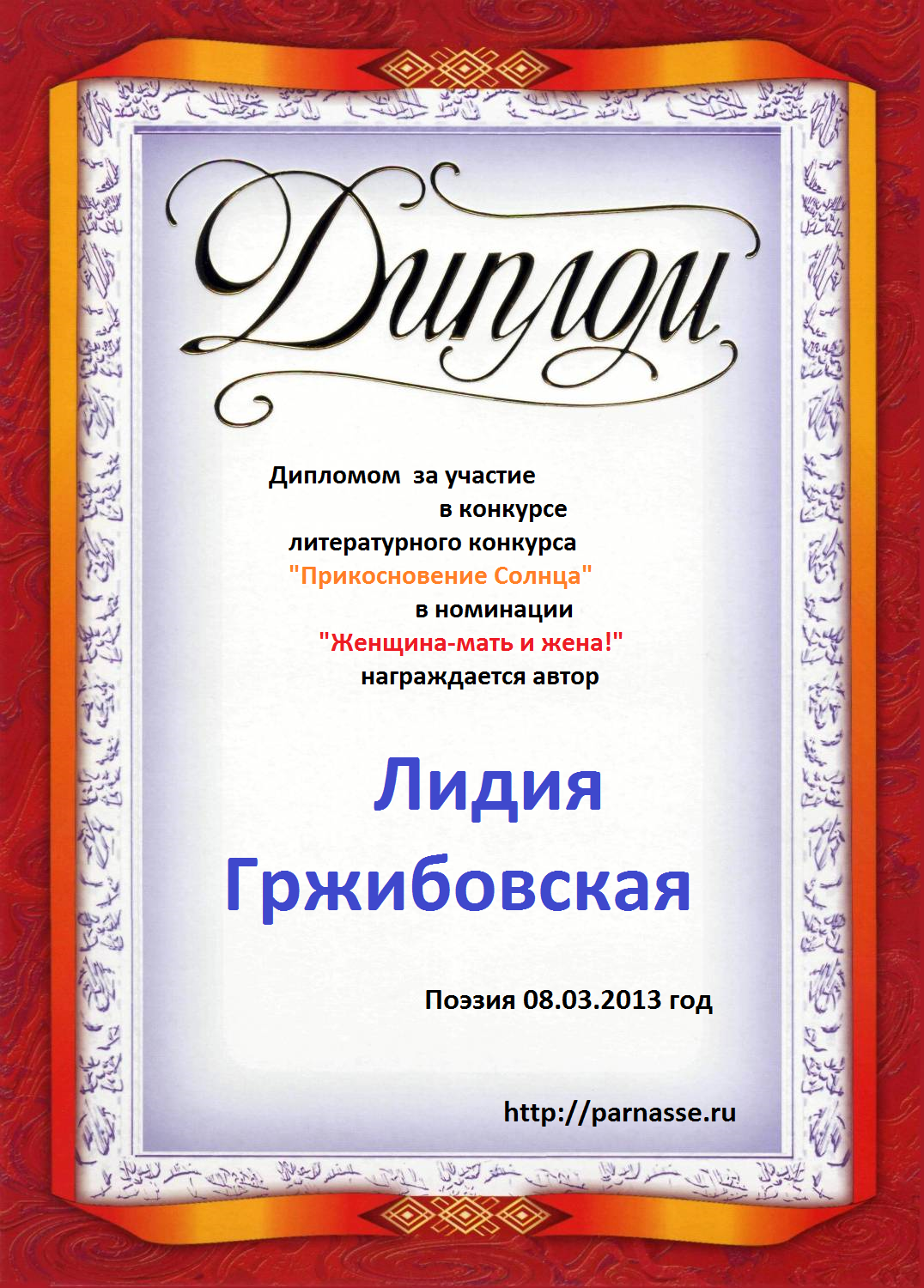 Диплом в конкурсе поэзии "Прикосновение Солнца"