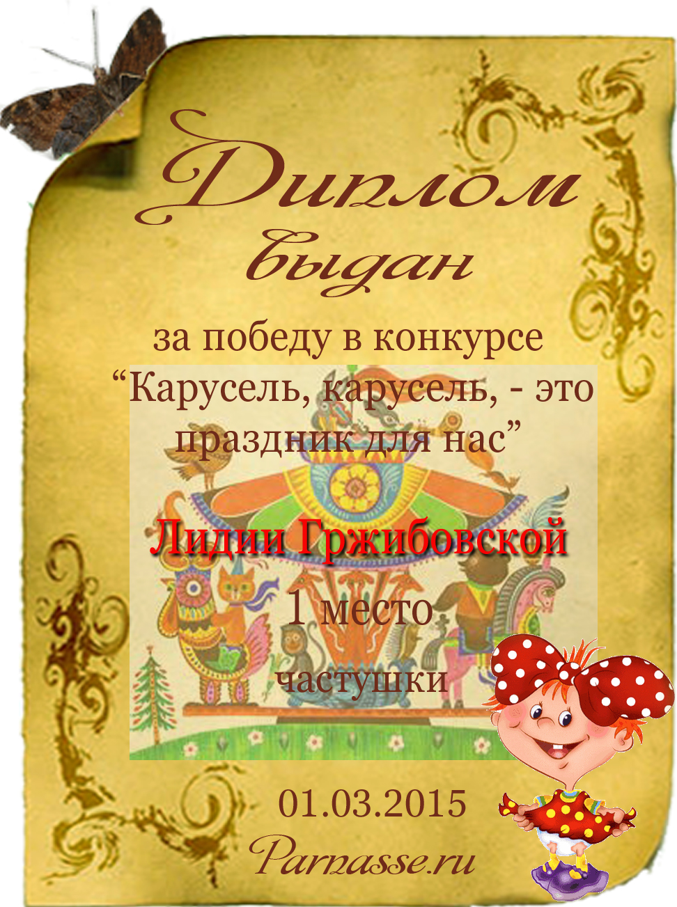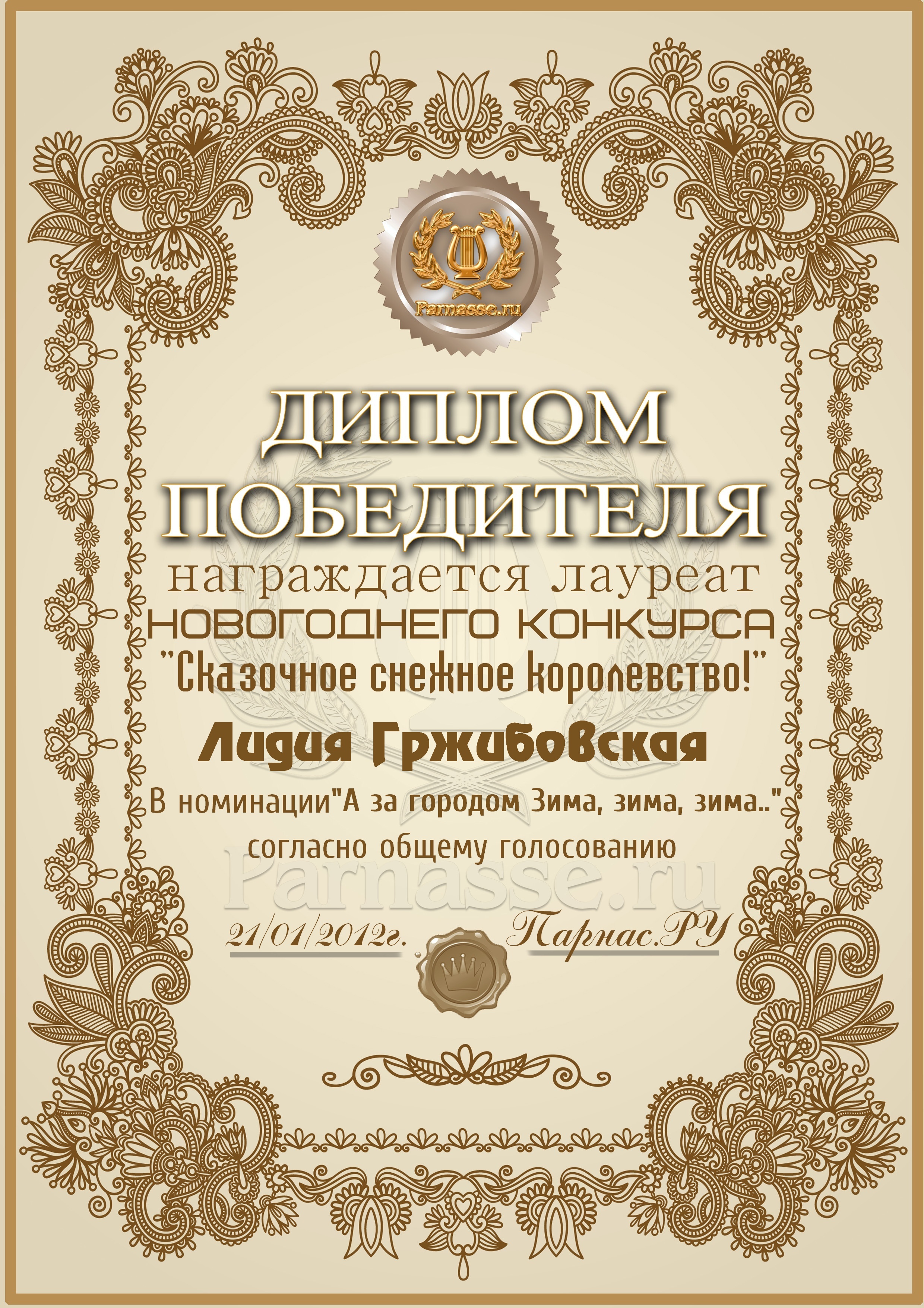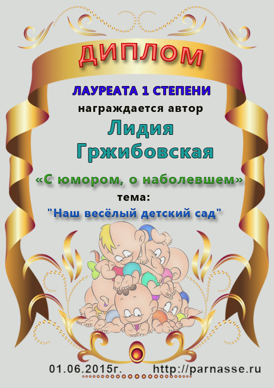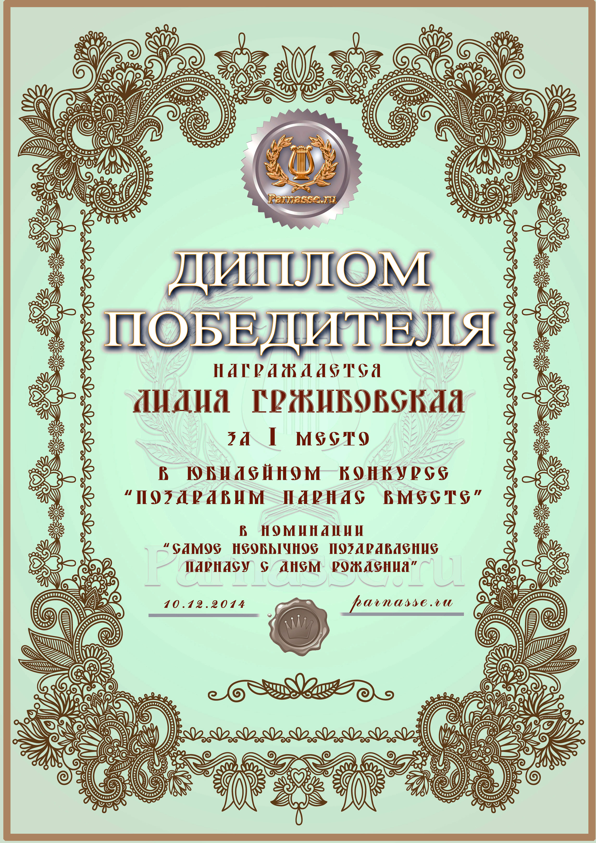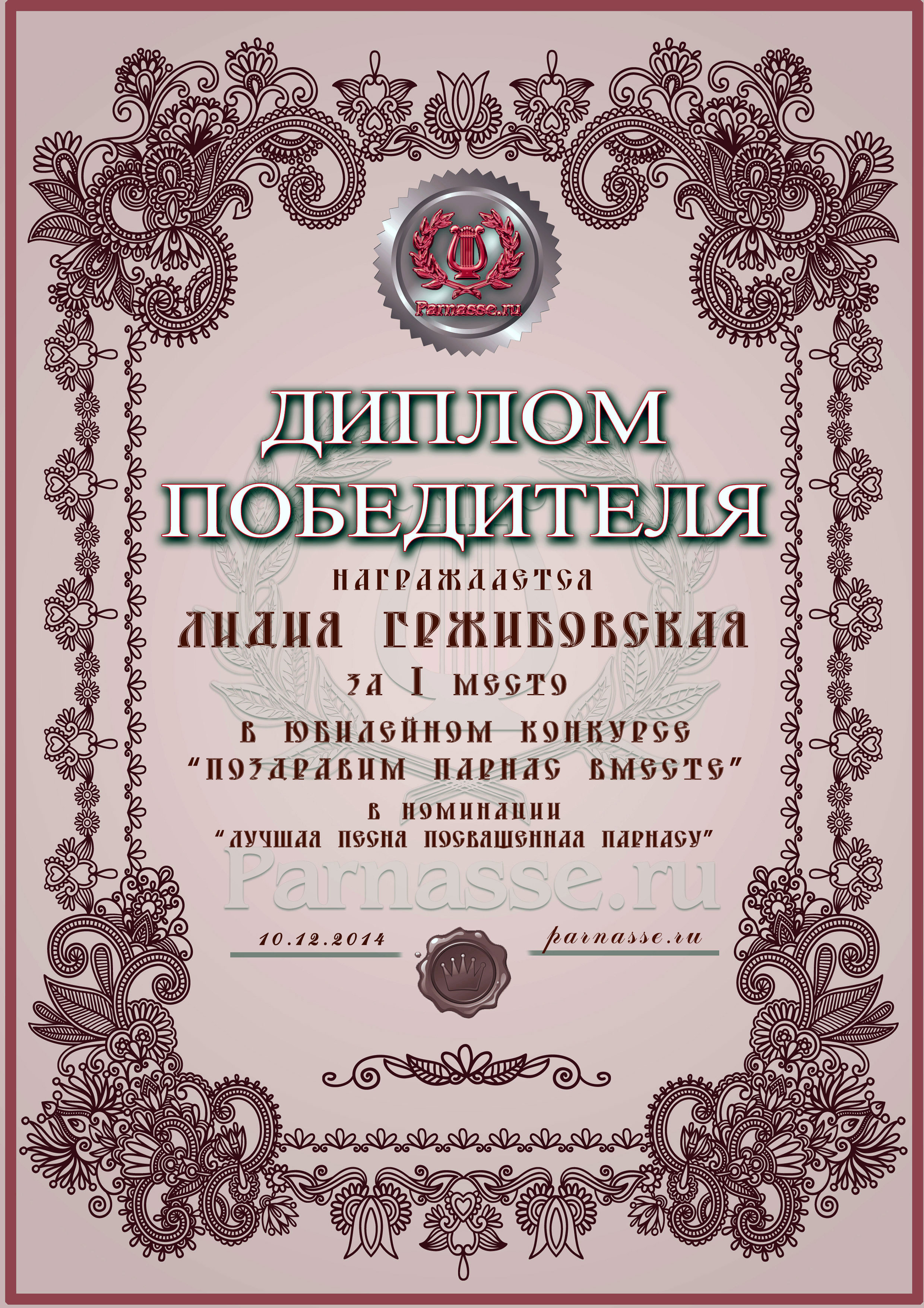 Диплом Победителя за 1 место в праздничном конкурсе "Поздравим Парнас с трёхлетием вместе!"