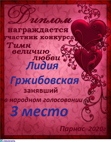 Третье место по итогам конкурса " Любовь – возвышенное чувство", народное голосование. Поздравляем с прекрасной победой!
