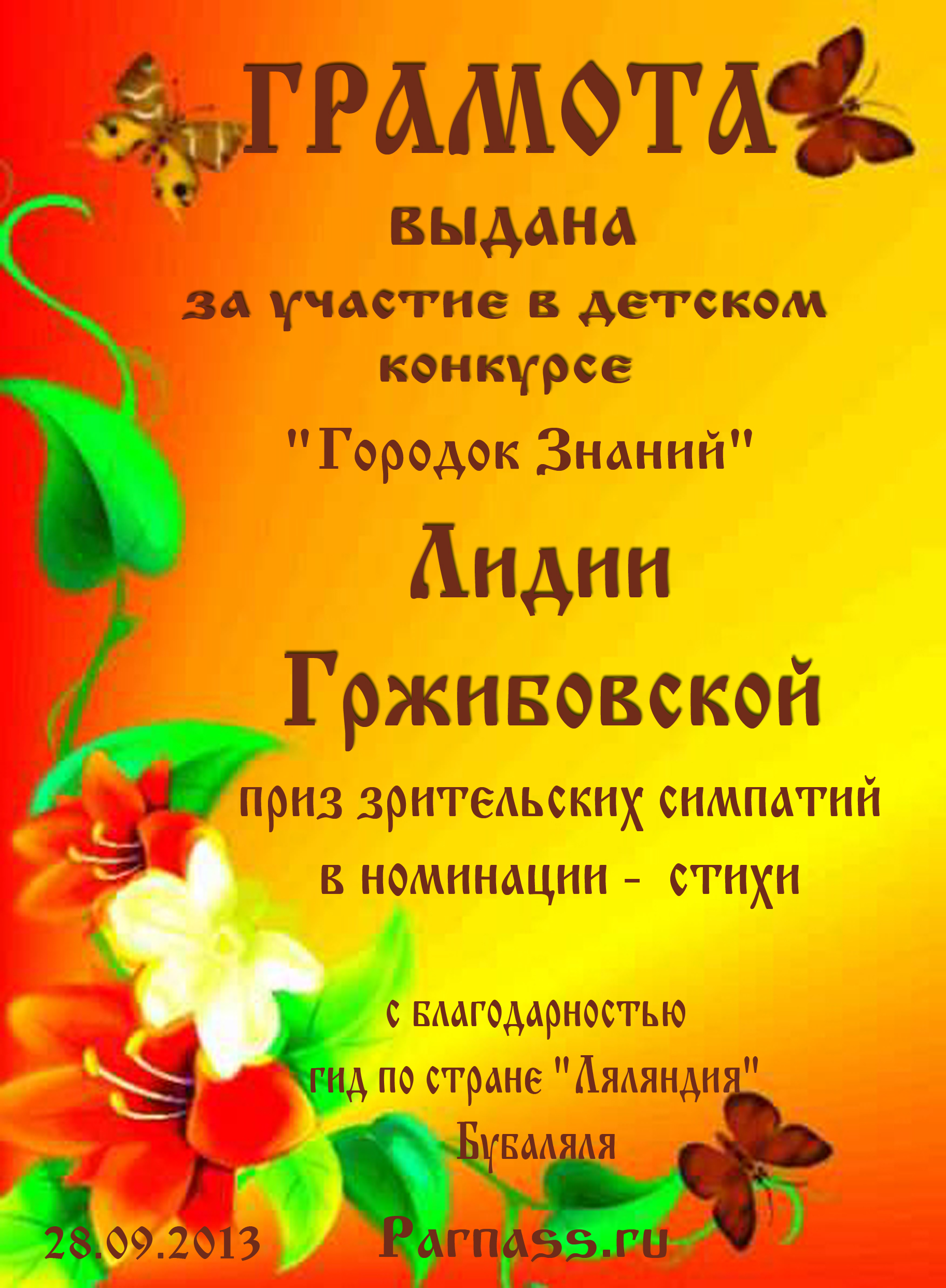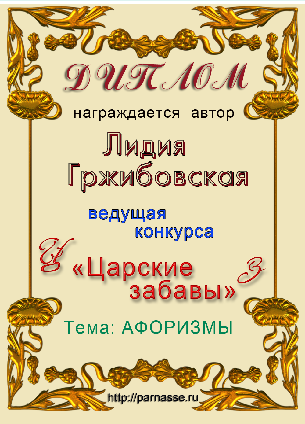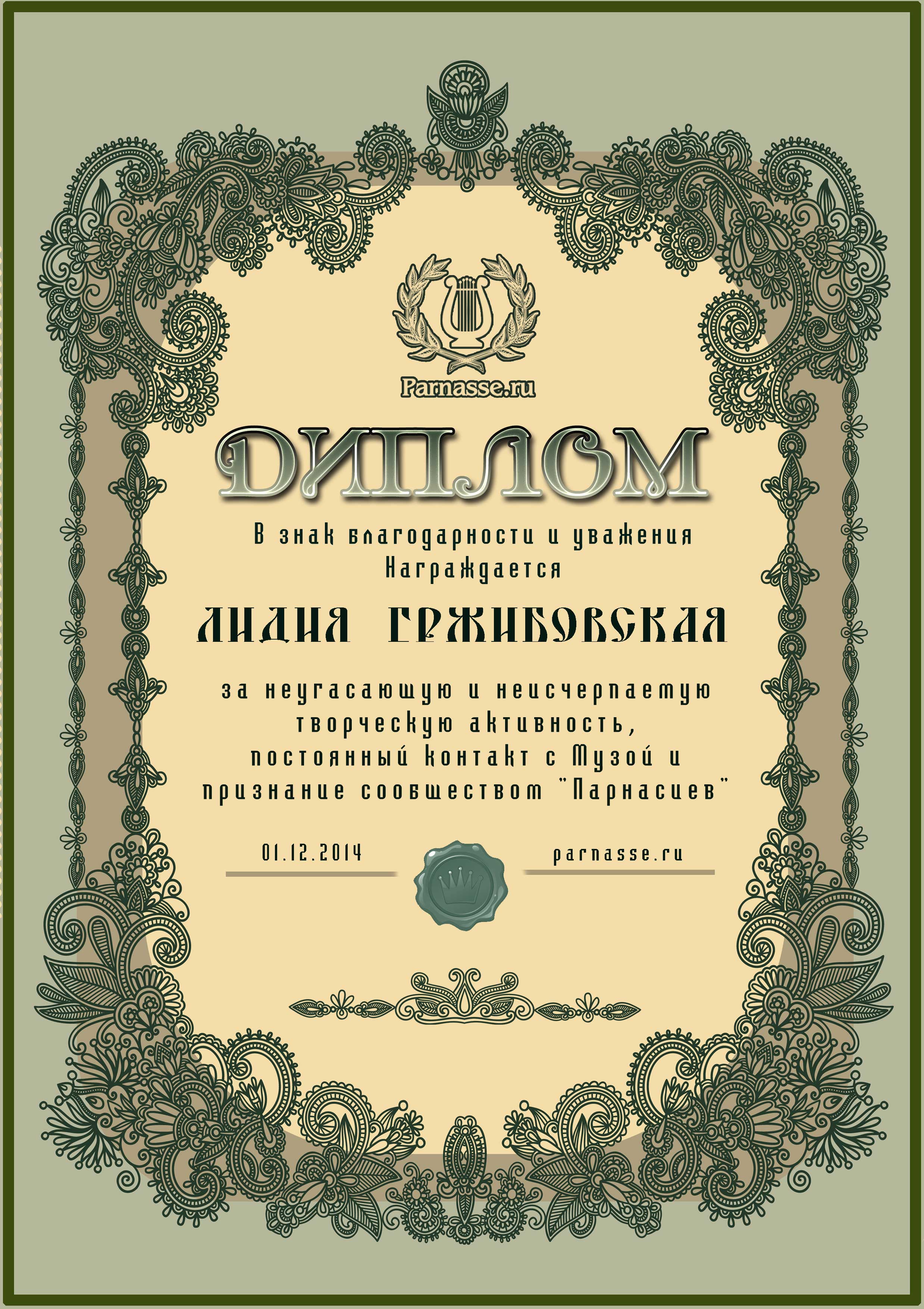 Диплом за вклад в развитие Парнаса