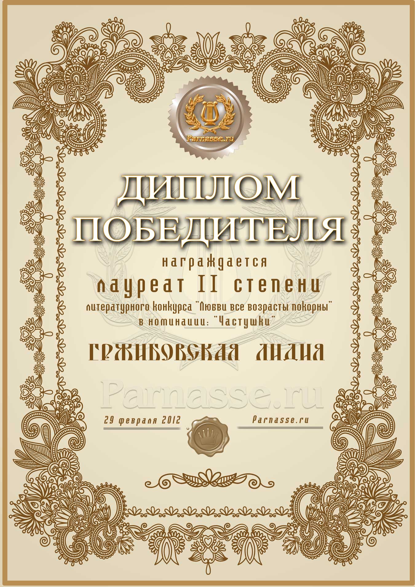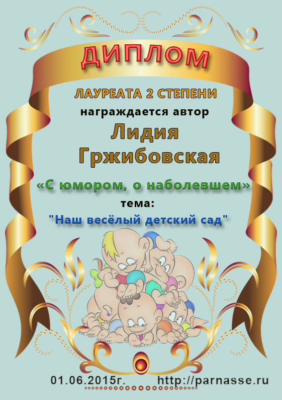 Диплом лауреата II степени сетевого лит. конкурса "Любви все возрасты покорны" в номинации "Частушки", (Общее голосование).