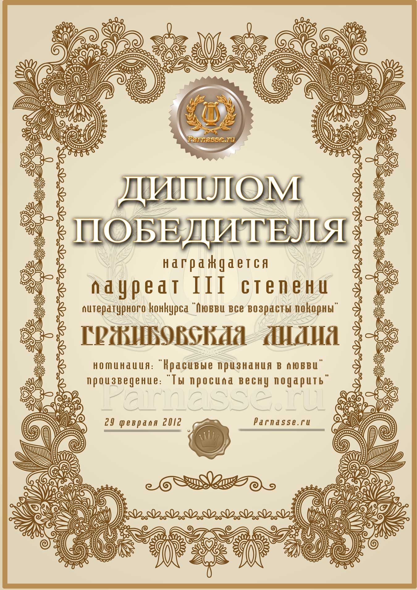 Диплом лауреата III степени лит.конкурса "Любви все возрасты покорны"