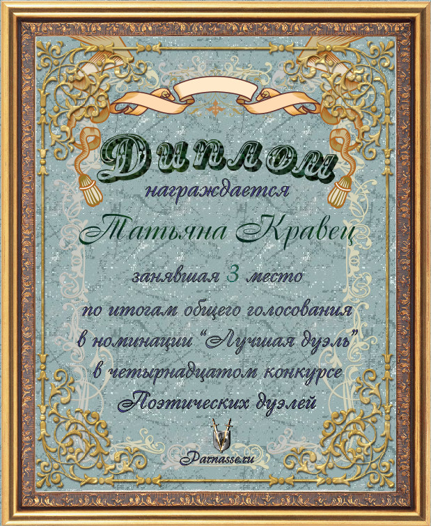 Диплом за 3-е место в номинации "ЛУЧШАЯ ДУЭЛЬ" по итогам общего голосования в 14ом конкурсе поэтических дуэлей (№ 13.1)