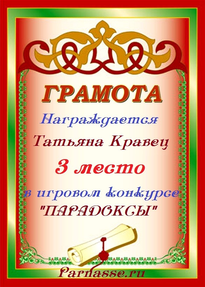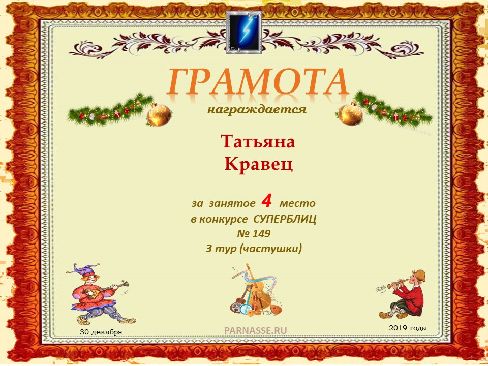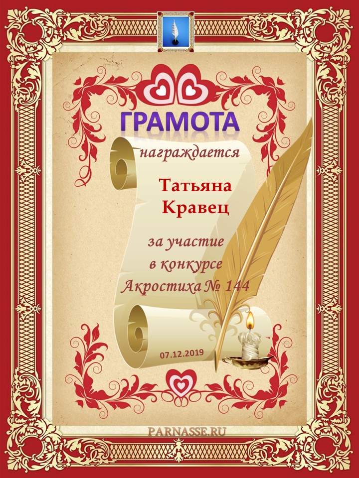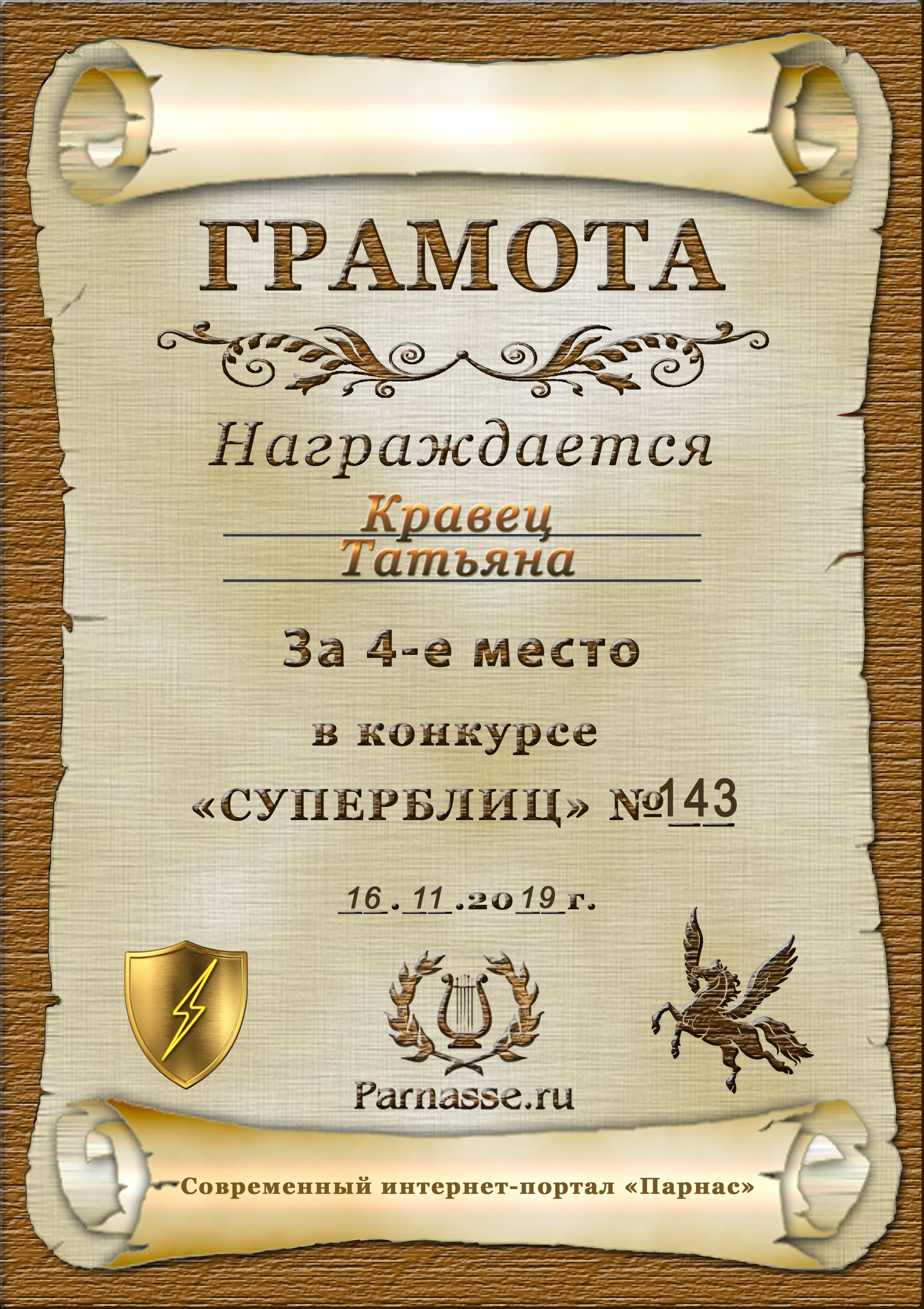 Грамота за 4 место в 111 конкурсе АКРОСТИХА (Альтернатива)! ПОЗДРАВЛЯЮ!