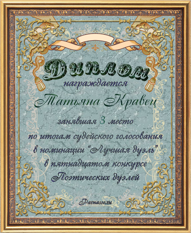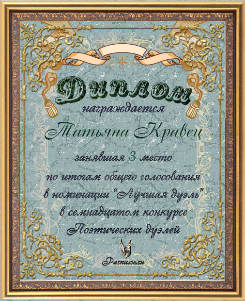 Диплом за 3-е место в номинации "ЛУЧШАЯ ДУЭЛЬ" по итогам общего голосования в 17ом конкурсе поэтических дуэлей (№ 3.2)