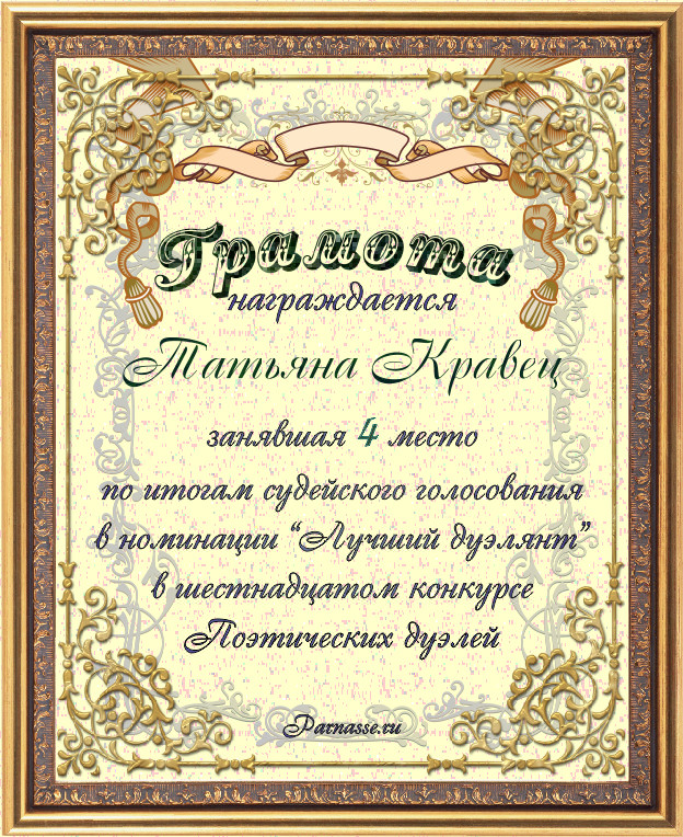 Грамота за 4-е место в номинации "ЛУЧШИЙ ДУЭЛЯНТ" по итогам судейского голосования в 16ом конкурсе поэтических дуэлей