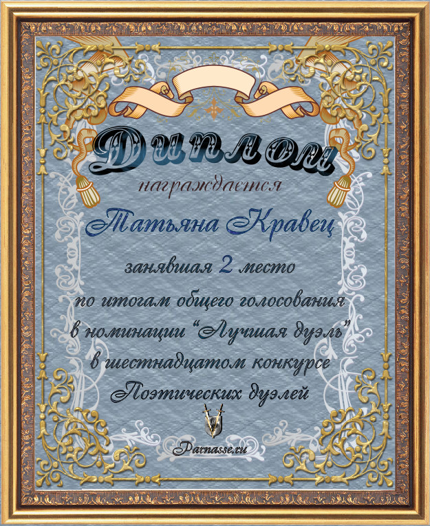 Диплом за 2-е место в номинации "ЛУЧШАЯ ДУЭЛЬ" по итогам общего голосования в 16ом конкурсе поэтических дуэлей (№ 11.1)