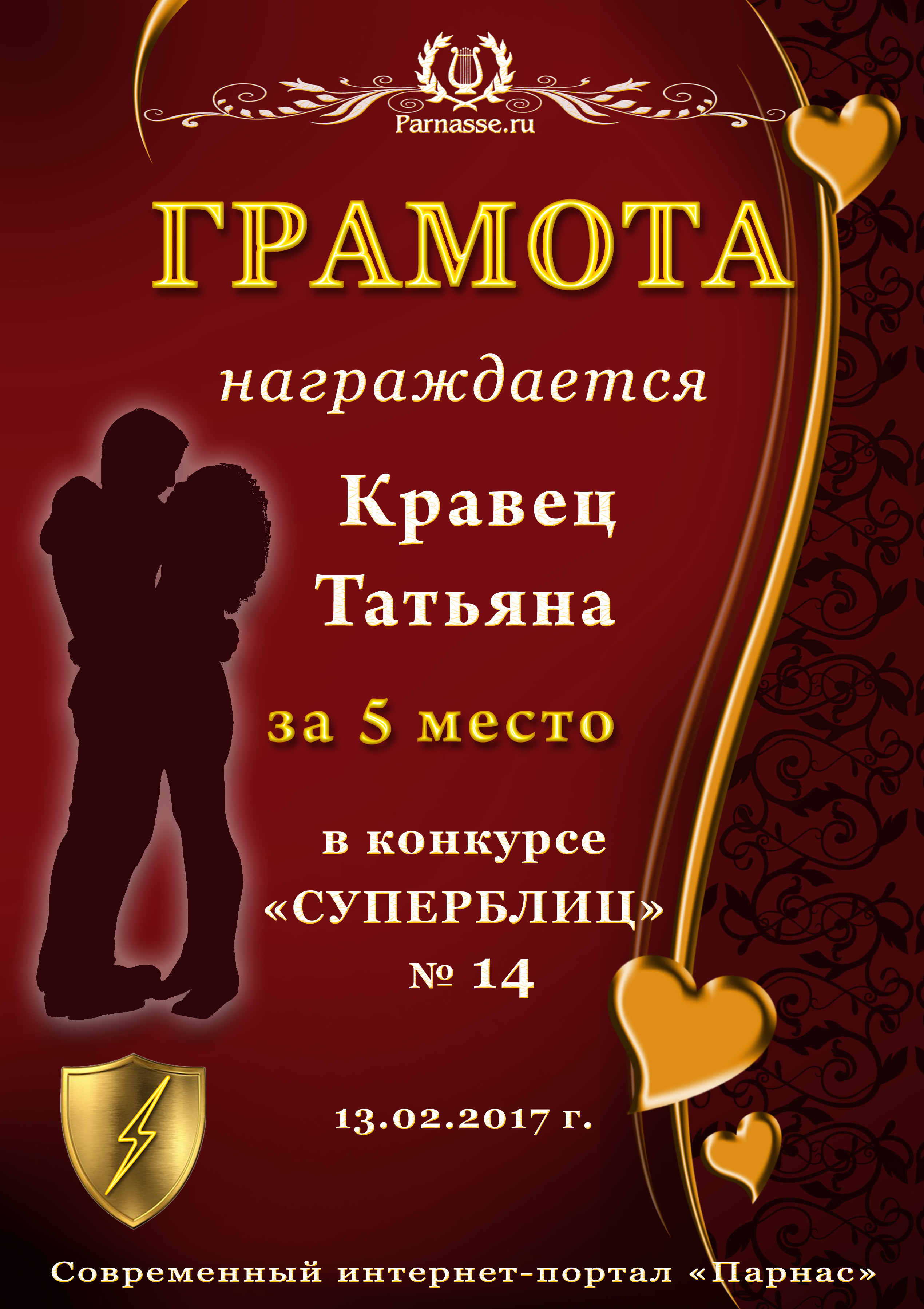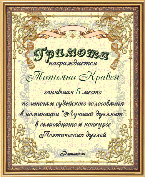 Грамота за 5-е место в номинации "ЛУЧШИЙ ДУЭЛЯНТ" по итогам судейского голосования в 17ом конкурсе поэтических дуэлей