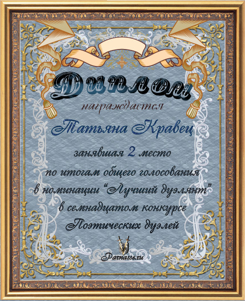 Диплом за 2-е место в номинации "ЛУЧШИЙ ДУЭЛЯНТ" по итогам общего голосования в 17ом конкурсе поэтических дуэлей
