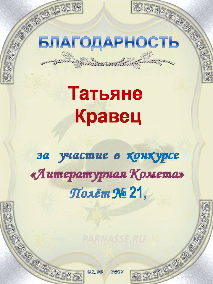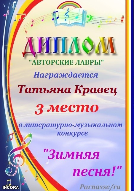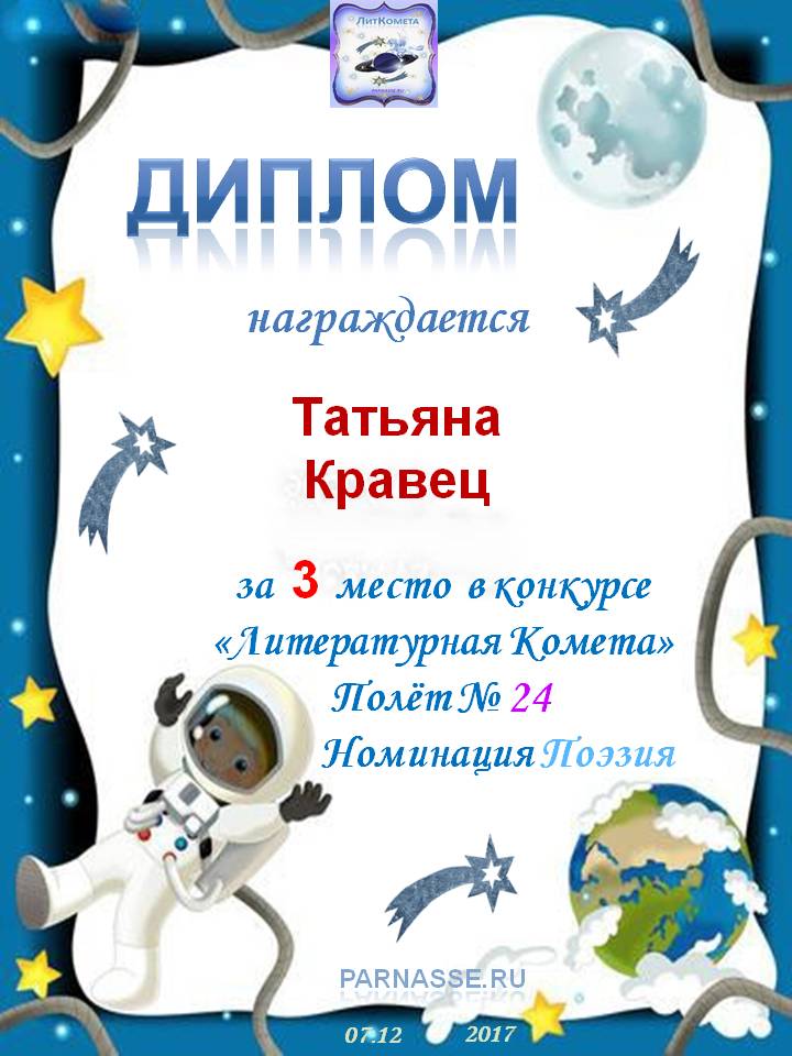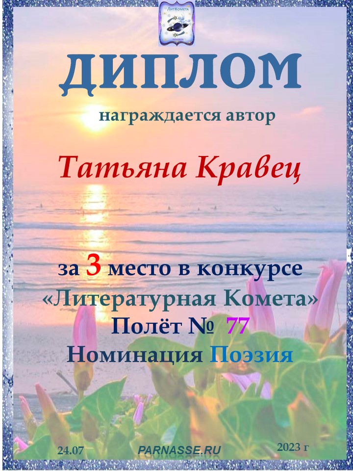 Поздравляю с 3 местом в конкурсе "Литературная Комета - Полёт № 24" номинация Поэзия! Спасибо за творчество!