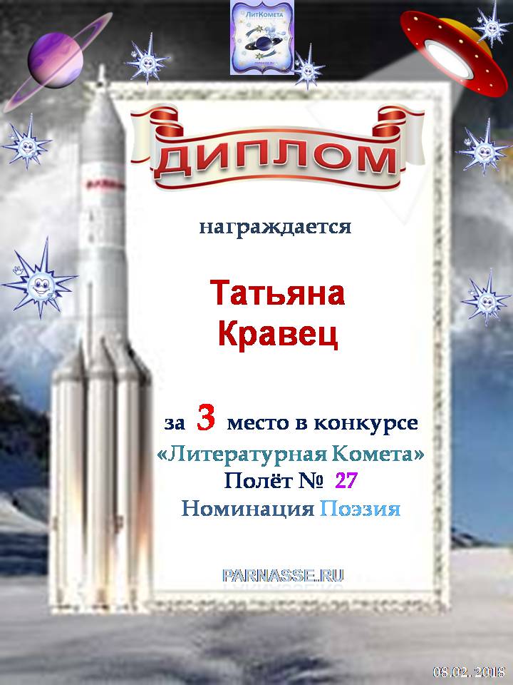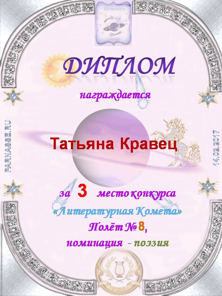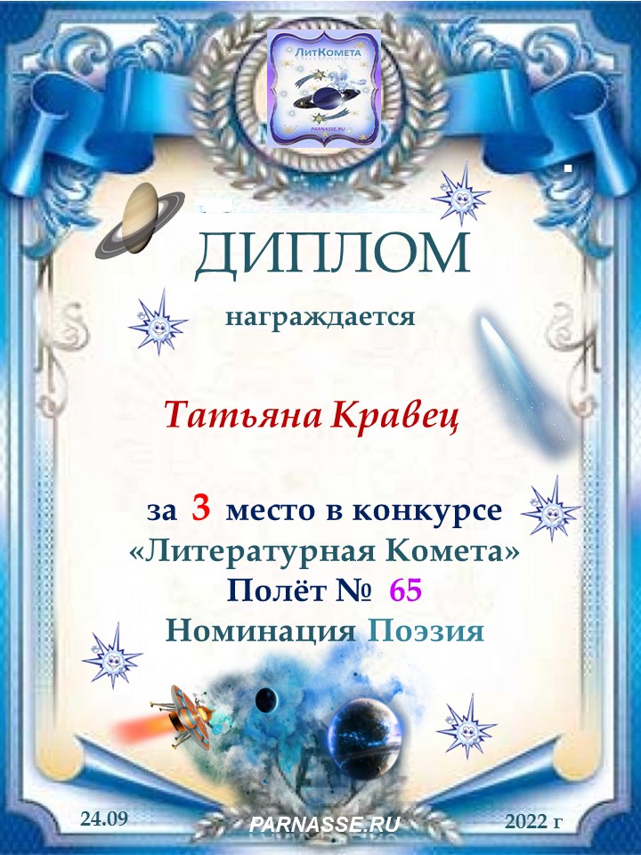 Поздравляю с занятым 3 местом в конкурсе "ЛитКомета-Полёт № 65" в Номинации Поэзия!
