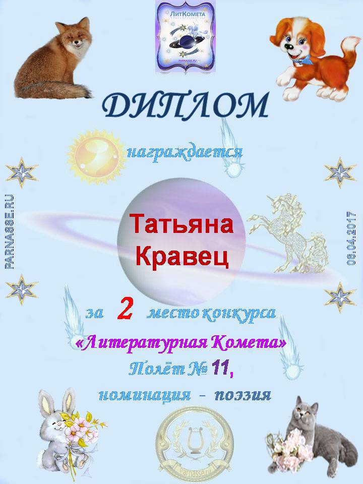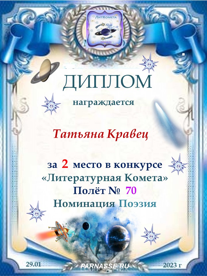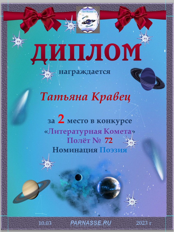 Поздравляю с занятым 2 местом в конкурсе "ЛитКомета-Полёт № 67" - Номинация Поэзия!