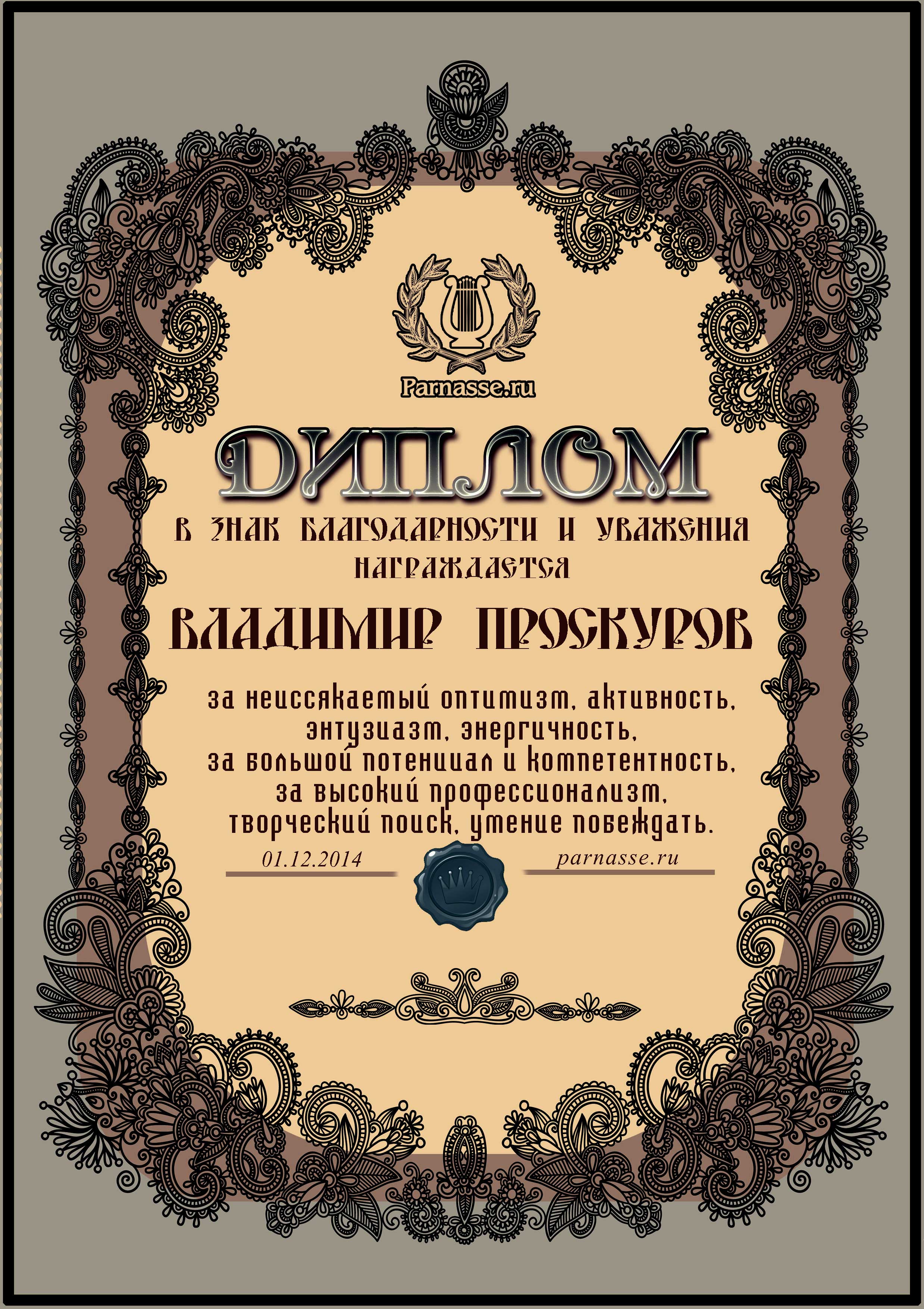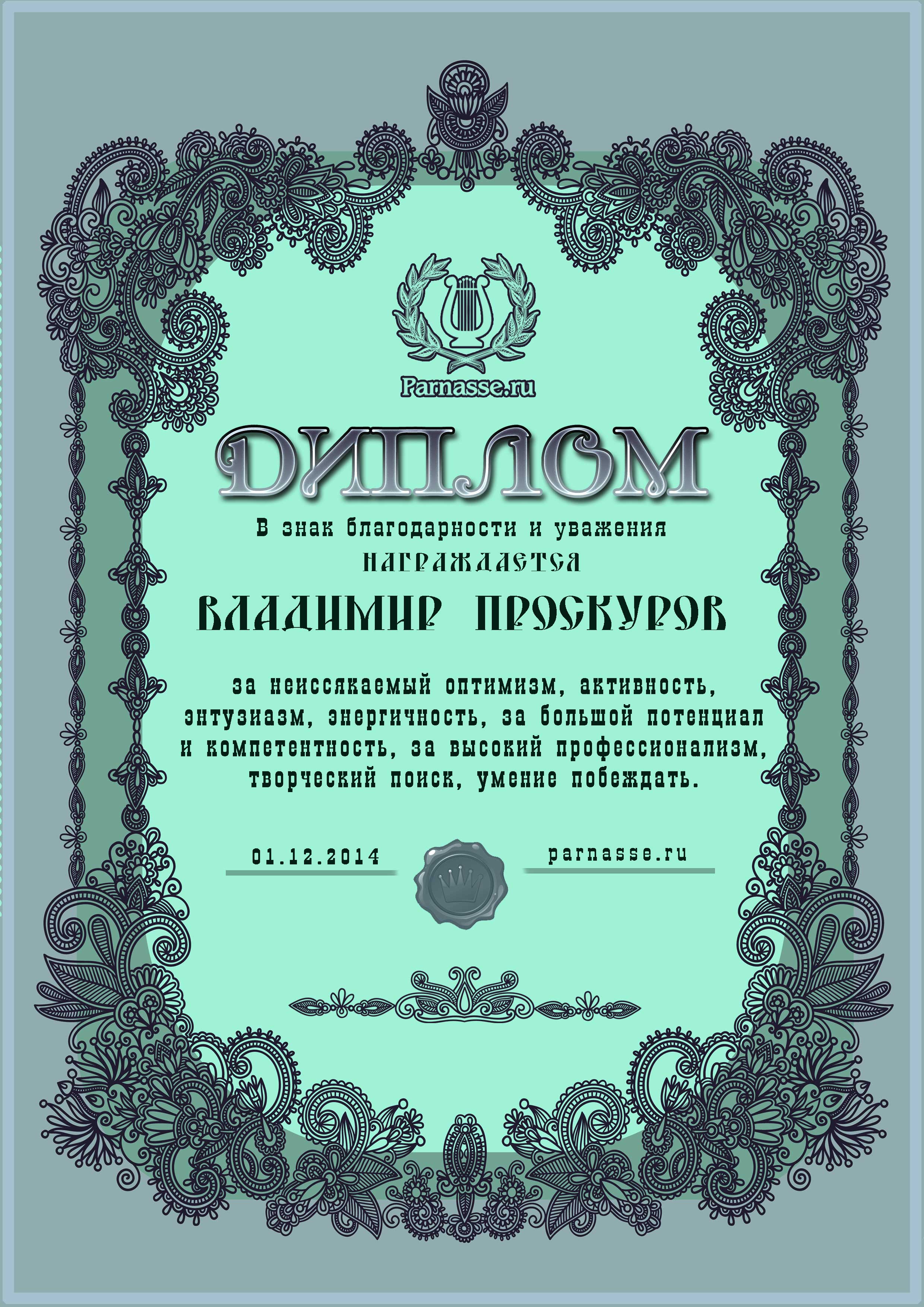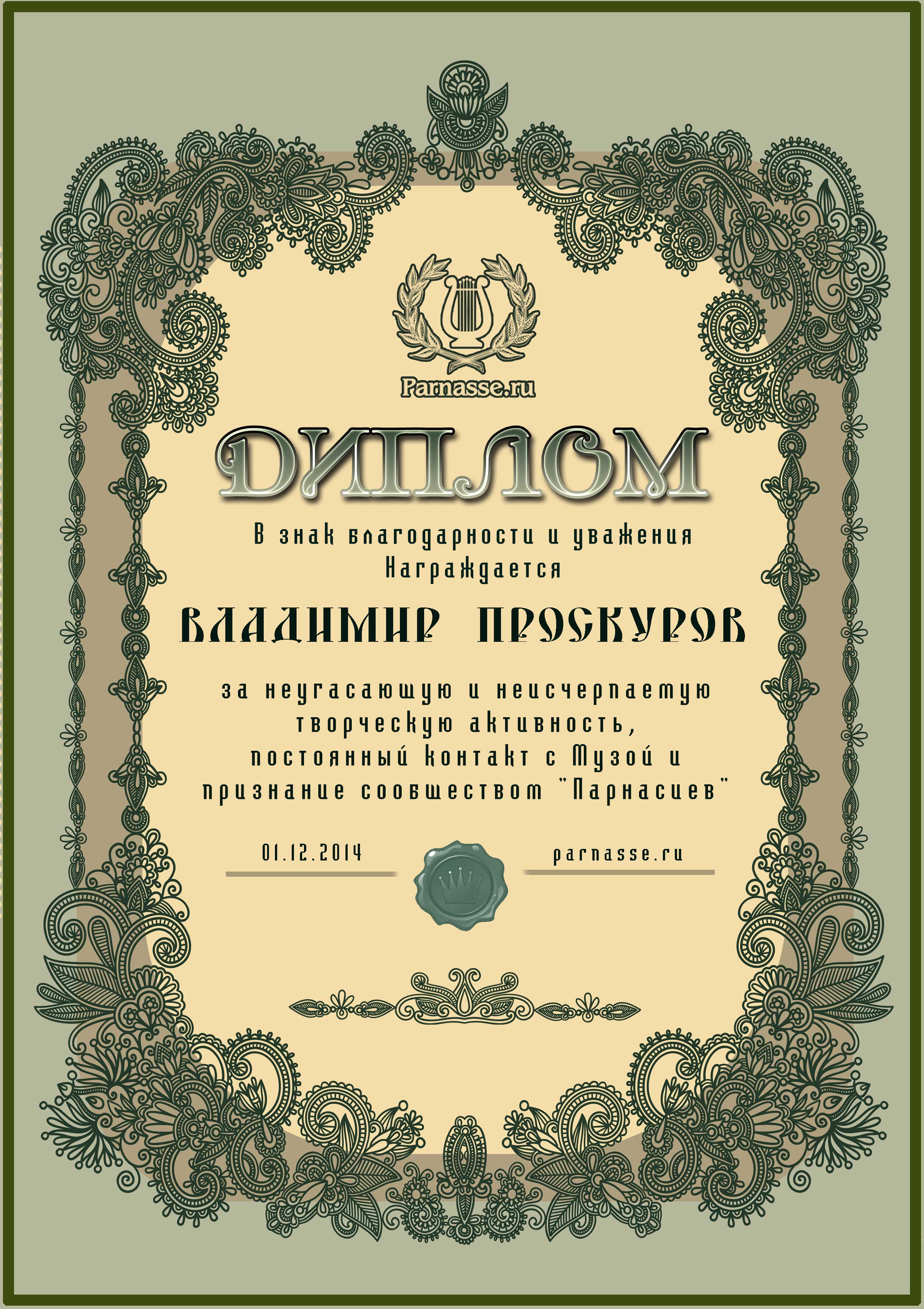 За неугасающую и неисчерпаемую творческую активность, постоянный контакт с Музой и признание сообществом "Парнасцев".