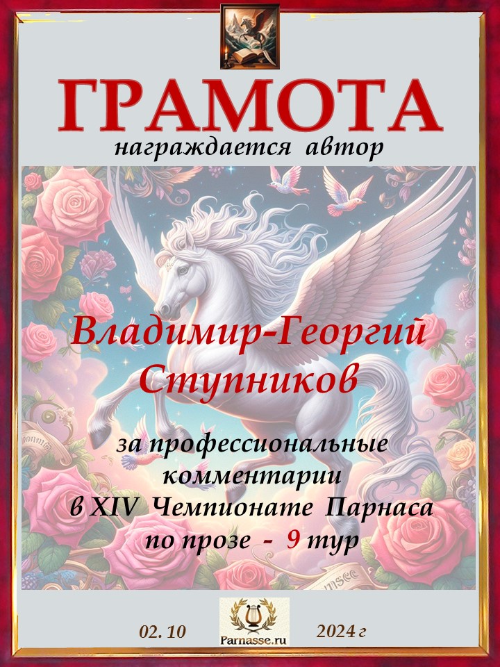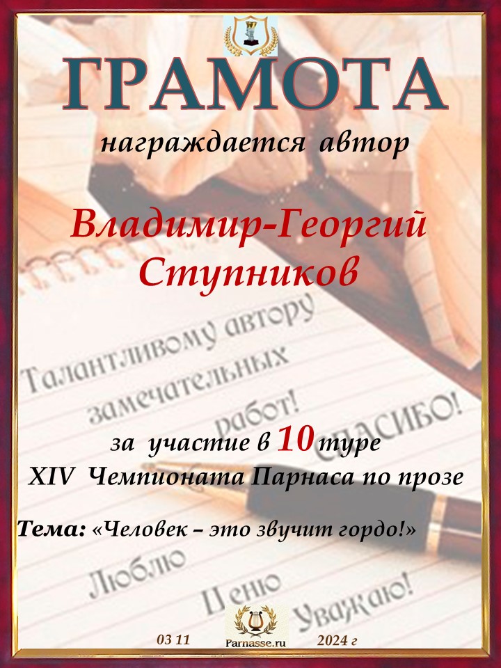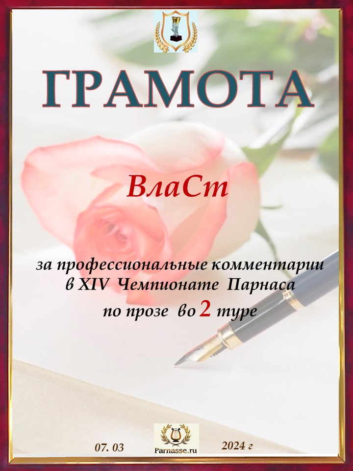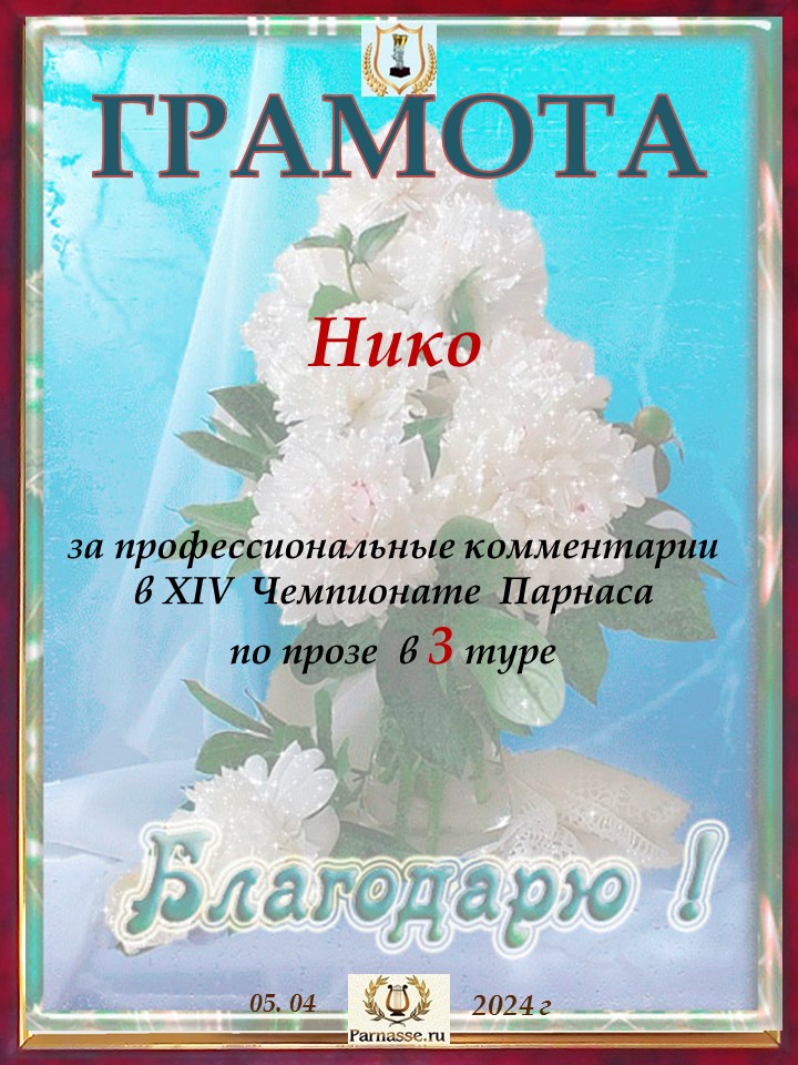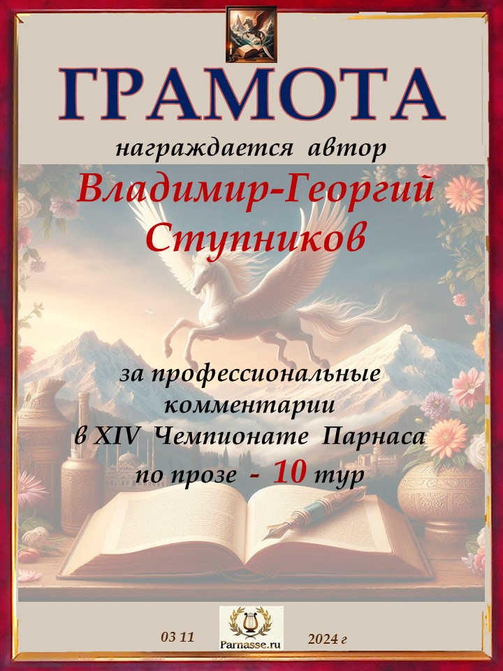 Спасибо за литературную поддержку конкурса и творческий вклад в 10 тур XIV Чемпионате Парнаса по прозе!