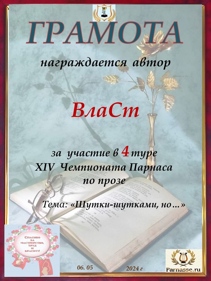 ![]() Медаль автора - участника 4 тура XIV Чемпионата Парнаса по прозе